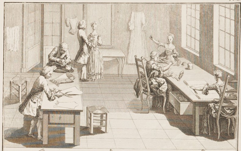 Figure 1. François Alexandre Pierre de Garsault II. Staymaker’s Studio. Art du tailleur, contenant le tailleur d’habits d’hommes: les culottes de peau; le tailleur de corps de femmes & enfants; la couturiere; & la marchande de modes (1769), detail of Plate 13. Bunka Gakuen University Library.