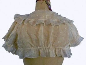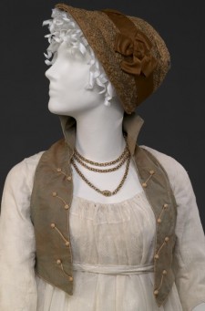 While many embraced the new high waistlines and more simplified corsets, there were likely many who were not completely comfortable with a bosom that jiggled. One of the easiest ways to date dresses from the late 1790s to about 1810 is that many had a new type of construction that included a separate linen section that pinned or laced in the front. This linen band held in the bosom and added an additional layer before the fashion fabric was gathered over the top (Figure 16). In the late 1790s other fast fads centered on sleeveless short vests, corselets worn on the outside, and the newest clothing craze, the Canezou in France (Figure 17) and the Spencer in England (Figure 18). These were all secondary layers worn on the exterior to hide or support the new bosom.