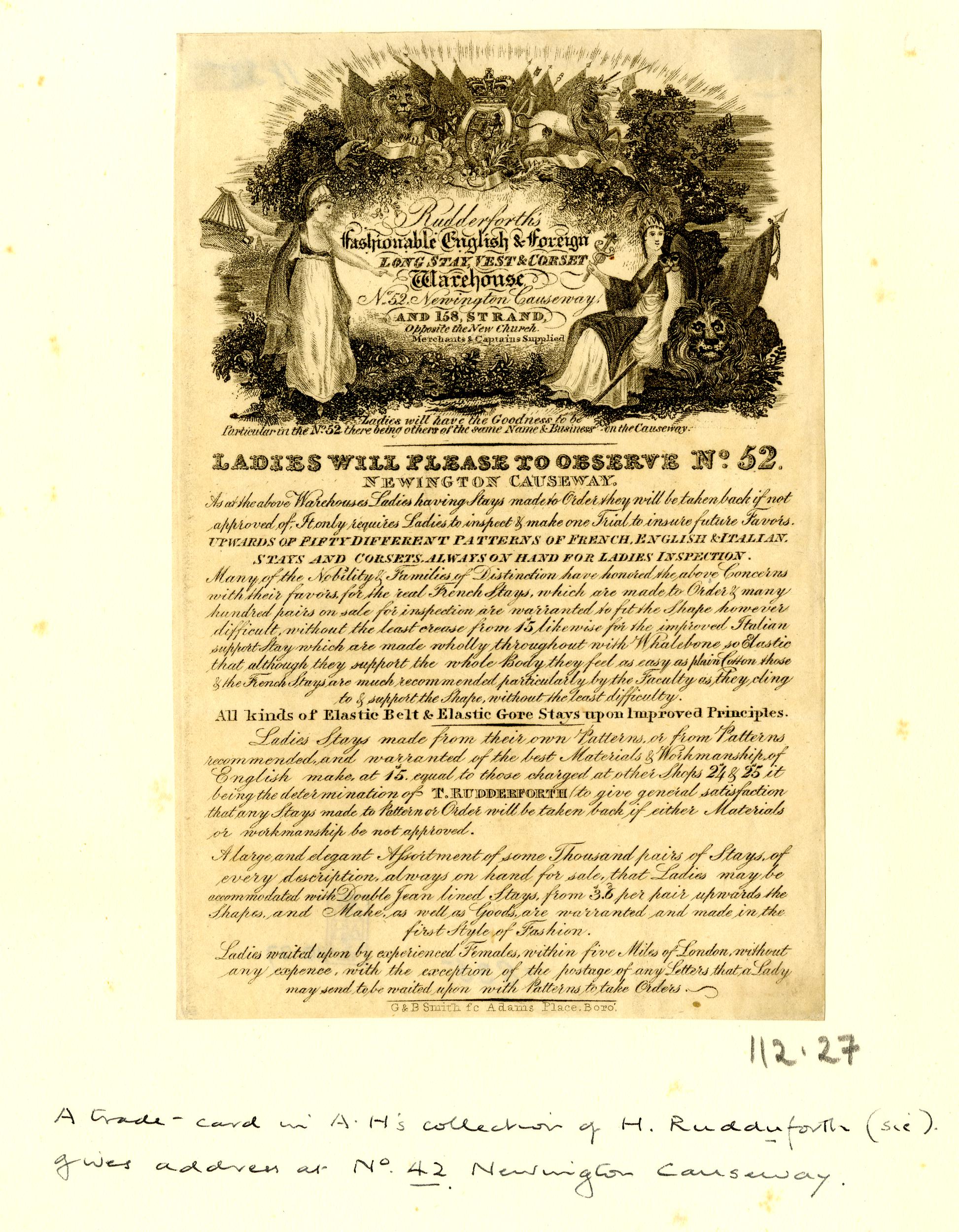 Figure 20. Trade card for Rudderforth, Stays and Corsets (c. 1785). Heal 112.27. © The Trustees of the British Museum.