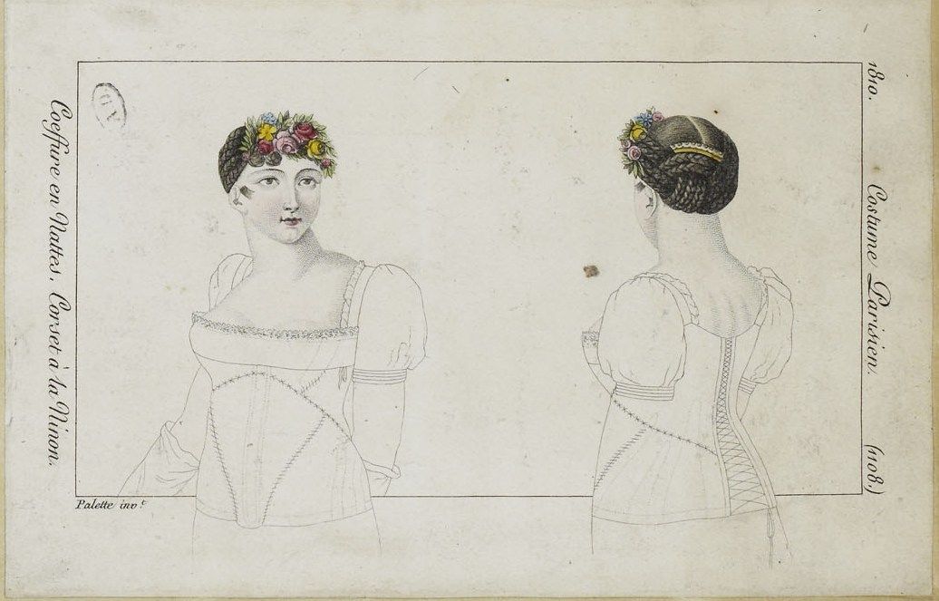 Figure 22. Costume Parisien: Coeffure en Nattes, Corset á la Ninon. Journal of Ladies and Fashion (1810).