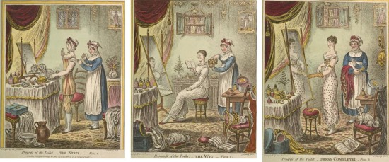 Figure 26. James Gillray. Progress of the Toilet: Plate 1: The Stays; Plate 2: The Wig; Plate 3: Dress Completed (Hannah Humphrey, 1810). Etchings. © The Trustees of the British Museum.