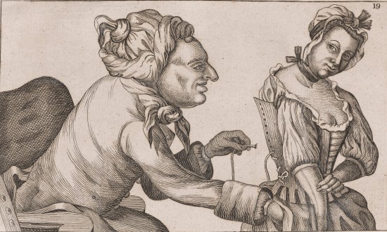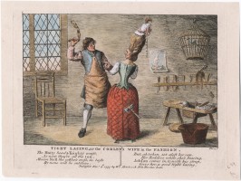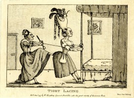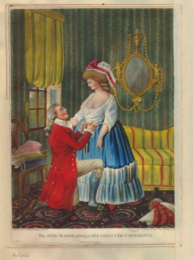 Such were the views of Austen and her contemporaries in the early 1800s, but how were stays perceived when Austen included the character of a staymaker in her youthful writing? As shown above, stays were shown as instruments of pride and vanity, but eighteenth-century satirical printmakers also frequently included them as objects of eroticism. A 1773 engraving from the publication Human Passions Delineated (Figure 27) likens the act of sexual penetration to the insertion of laces into the holes of the stay, which the male figure is doing as he puts his hand into the female figure’s skirt pocket to touch her genitals (Steele 21).