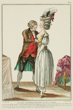 Figure 32. Nicolas Dupin after Pierre-Thomas LeClerc. Tailleur Costumier Essayant un Cor à la Mode [Tailor Trying a Fashionable Body] (1778). “Galerie des Modes, 15e Cahier, 1ere Figure.” A Most Beguiling Accomplishment. 10 Nov. 2012. http://www.mimicofmodes.com/2012/11/galerie-des-modes-15e-cahier-1ere-figure.html.