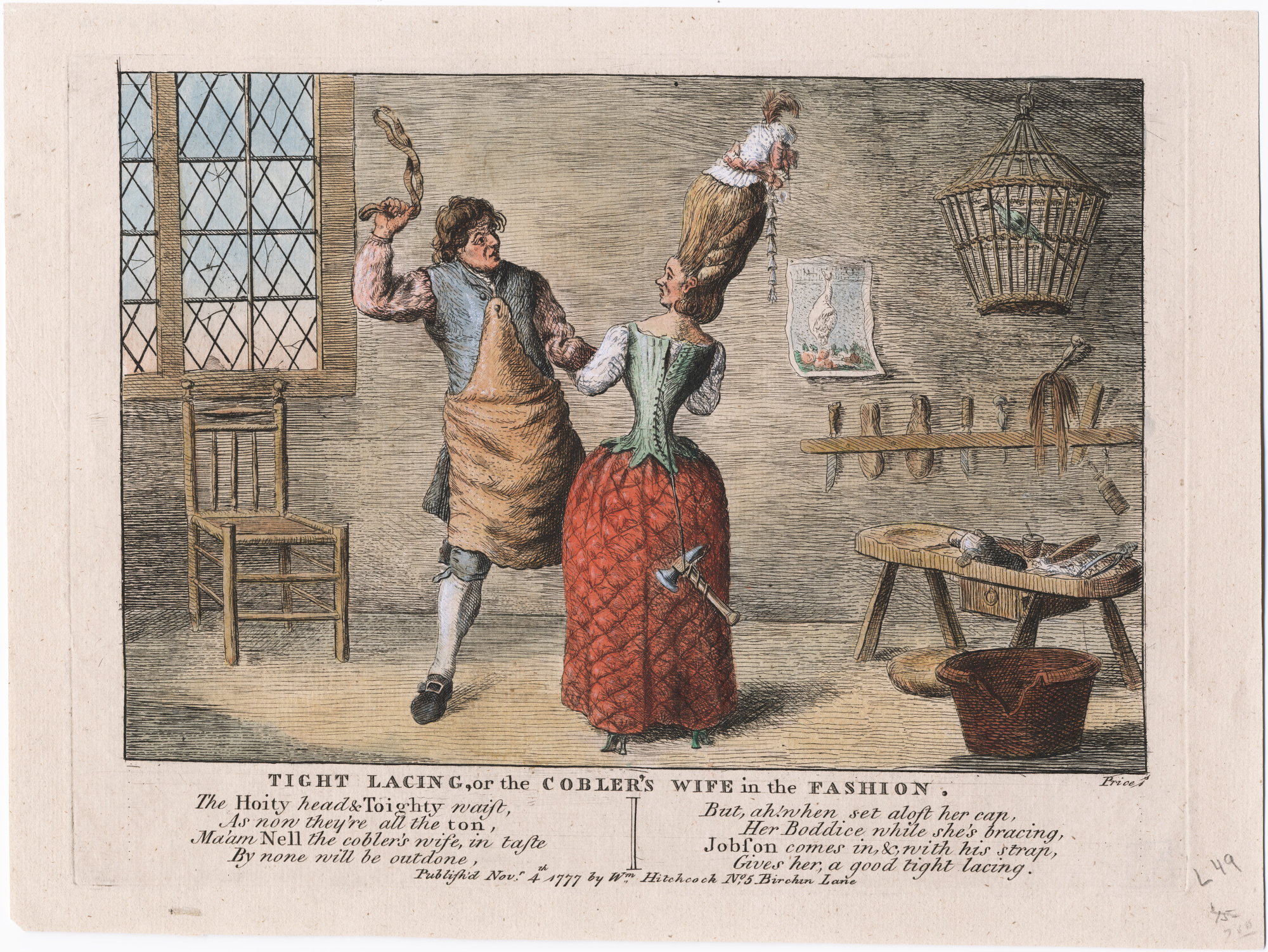 Figure 5. William Hitchcock. Tight Lacing, or, The Cobler’s Wife in the Fashion (1777). Hand-colored etching. Lewis Walpole Library, 777.11.04.01+.
