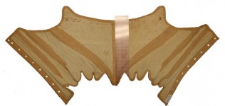 Stays were an additional aid to this prow-shaped look; a wider center front piece was created, and straps were set at the edge of the armhole. There were several other construction methods that led to the full and broad shape. A fully boned pair of stays with the front bones set at eighty degrees easily creates a prow-front look (Figure 8). If one preferred fewer bones, a trellis style of vertical and horizontal bones could be used (Figure 9), or horizontal bones could be set at the top of the bust line (Figure 10).