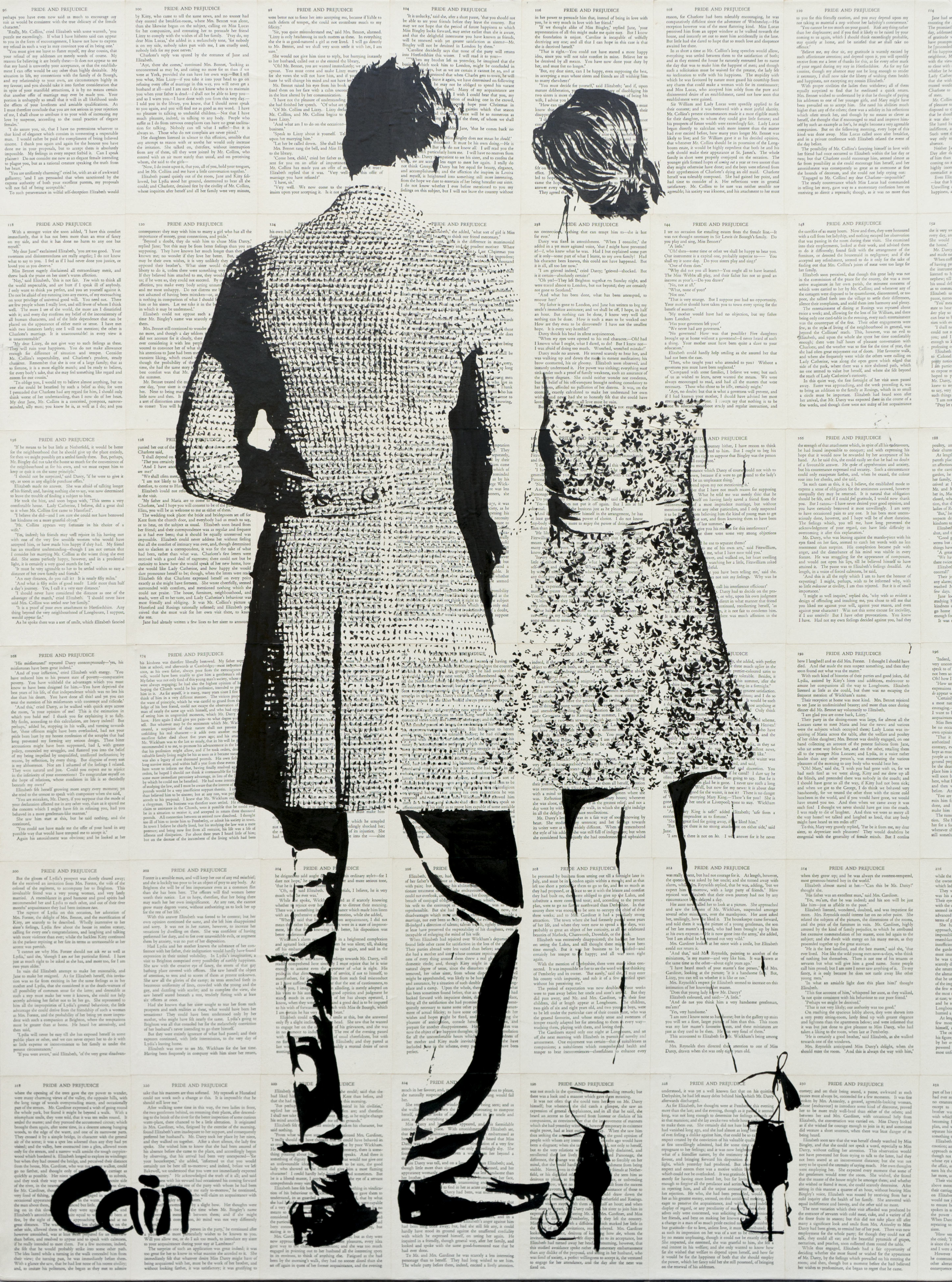 There are other artists who, like Mille, literally use Austen’s words as part of their canvas and also choose to have the subject facing away from the viewer in order to create a connection between past and present. The artist Cain, from Great Britain, paints contemporary figures atop vintage book pages. In First Impressions (2016, the title clearly demonstrating Cain’s knowledge of Austen), which is part of Cain’s series Romance and Beauty, he uses antique book pages from Pride and Prejudice as “a backdrop to the painting, creating an interplay between the hand-painted subjects and the book’s narrative” (Cain). In this large-scale work, Cain connects the centuries, portraying a modern-day Darcy and Elizabeth Bennet, who appear to be engaged with the novel, literally imposed upon the pages of the text, backs to the viewer, as if they are reading those pages. As in Mille’s work, in Cain’s Austen’s words themselves become part of the characters’ skin; he hints at profiles, arms, and legs through shadows and details he draws with Indian ink. Cain prefers not to show the figures’ faces: “The lack of faces allows viewers to identify with the subjects and reflects a modern interpretation of the book’s characters” (Cain). This juxtaposition of reader and text, past and present not only suggests a contemporary rendering of the novel’s main characters but also creates a “visual dialogue” (McNay) between Austen’s time and ours, similar to what Grayson Perry portrayed on his vase.4