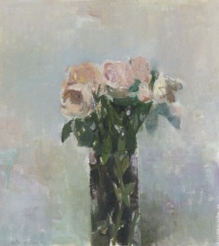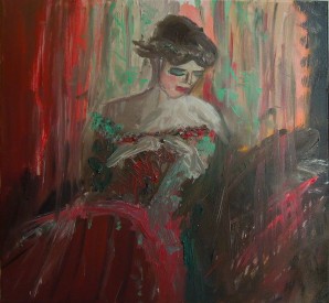 The next three artists are less representational in their Austen-inspired art. Their works are inspired by a feeling they have experienced while reading Austen that they then try to capture artistically. Elena Zolonitsky, a Russian artist who now lives in Oakland, California, grew up in Moscow and has read all Austen’s works, even sending me her favorite Jane Austen quotations. So how—beyond titles like Jane Austen’s Rose (2013) or Lady Jane (2013)—do Zolonitsky’s still lifes of roses connect with Austen? On the Saatchi website she describes her paintings as “[i]nspired by Jane Austen’s novels. They are best to read in the rose garden on a hot summer day!” In an email she explains: