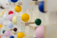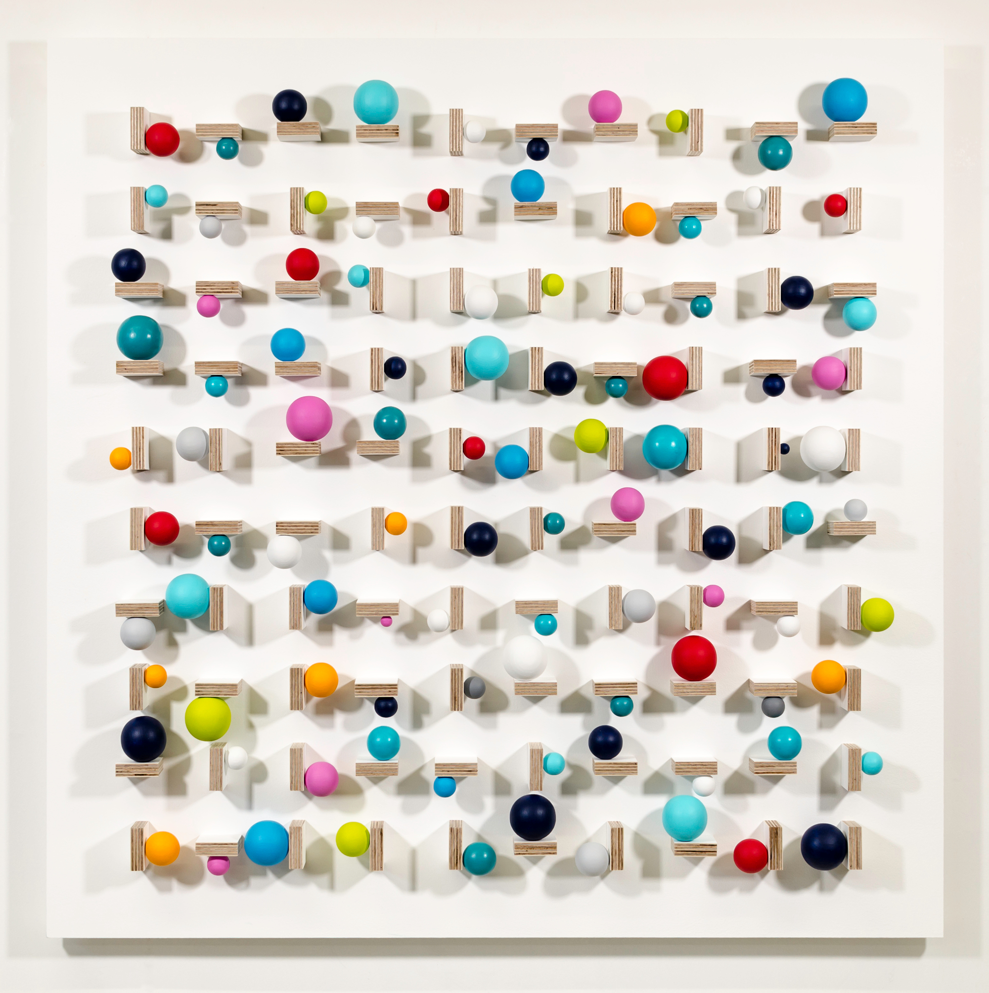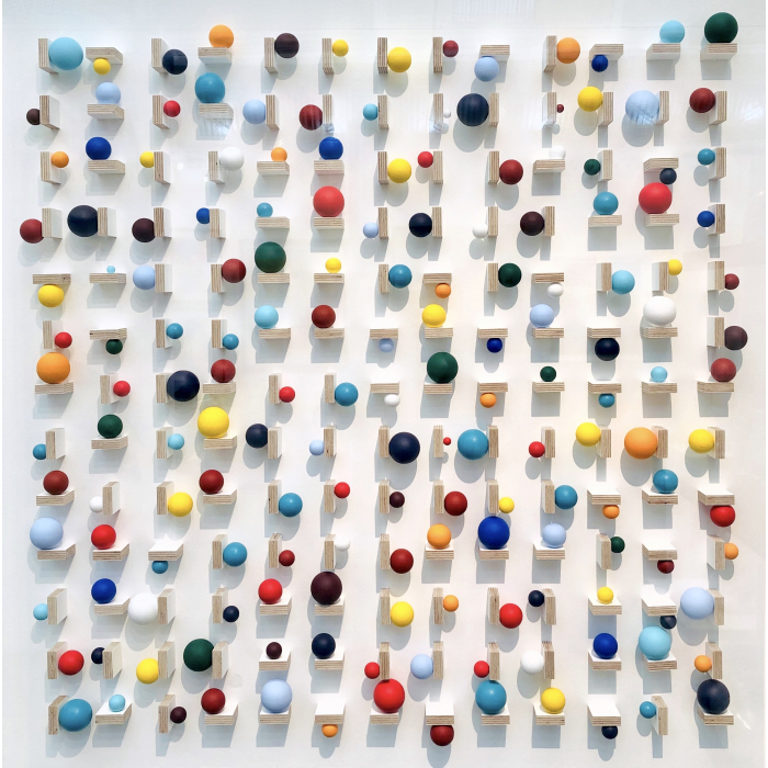 (Click here to see a larger version.)The artwork, Emma (2019), is from [my] Event and Incident Series. The series of works explores the idea of collected moments coming together to form an event. In this instance [I am] playing the moment just before an author writes out the first words of a book. The letters from the first ten words of the book are applied to various balls in the composition, making the viewer engage and search in the same way the author had to search [for] the words in the first place. . . . I enjoy the idea that we all have access to the letters of the alphabet but we are all not Jane Austen, William Shakespeare or Ernest Hemingway. The works are not about the actual books that they are titled after but more about the authors’ existence up to the moment they sat and penned the first ten words.
