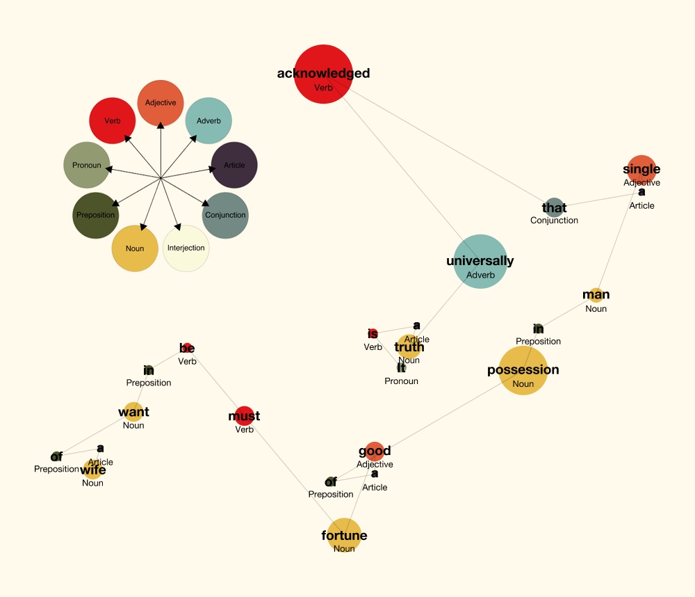 The same is true for Nicholas Rougeux, who employs Austen’s language and words as the basis for his literary experimentation. Rougeux is a Chicago-based multimedia artist, who has created digitally enhanced artworks using Austen’s texts. One Austen-inspired artwork was for a series entitled Literary Constellations (2017). He explains Literary Constellations as a series of posters designed to resemble constellation maps, but, instead of being based on real stars, the posters map first sentences from chapters of famous classic stories. Rougeux created constellations from the words of the first sentences of the first chapters of classic texts to draw paths based on word length and part of speech. Each part of speech is assigned a color; the length of the word determines the diameter of the circle. The directions of lines between the circles were based on what was being connected: noun, verb, adjective, etc. Rougeux used Jane Austen’s works as his first attempts in this experiment; ultimately, he felt shorter texts worked better and did not continue with Austen, but he did share his early attempt with me.