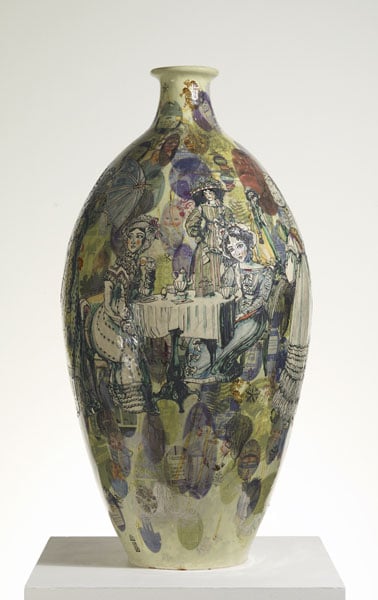 Perhaps the work of art that has garnered the most attention since 2000 as an example of Austen-inspired art is Grayson Perry’s Jane Austen in E17 (2009), a vase that juxtaposes elegantly dressed Georgian ladies drinking tea with contemporary sites right outside Perry’s studio in Walthamstow, Greater London (the E17 postal district of the title). With its images of ladies in Regency costume surrounded by and sitting atop “photographs and advertisements taken from contemporary gossip magazines and sites” from around Perry’s neighborhood, this striking vase cleverly highlights “how far and yet how near east London now is from Hampshire two centuries ago” (McNay). This connection between past and present is a theme several twenty-first-century artists explore in their Austen-inspired artworks, but when pressed to explain the meaning of his vase himself, Perry simply says, “Embarrassing as it is for an artist to admit nowadays, I was really striving for beauty” (McNay).