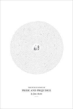 All letters, numbers, spaces, and line breaks were removed from entire texts of classic stories like Pride and Prejudice—leaving only the punctuation in one continuous line of symbols in the order they appear in the text. The remaining punctuation was arranged in a spiral, starting at the top center with markings for each chapter and classic illustrations at the center.