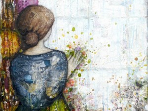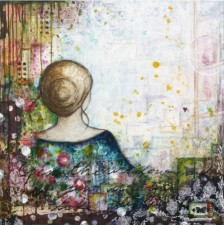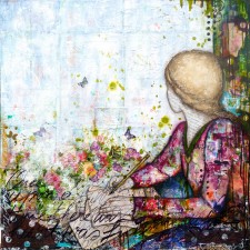 Windows are a motif in Mille’s four Austen collage-style paintings, which depict Austen herself and three of her heroines. All four of Mille’s Austen works portray romantic versions of Austen and her characters, but they are alone: they gaze out windows longing for either love or freedom. No couples are featured here, but the paintings are romantic nonetheless, with flowers, butterflies, and a soft color palette of pinks, purples, soft blues, and greens, which all blend together to achieve a lovely collage effect. For instance, in Once Upon a Time (Dear Jane) (2014), Mille portrays the author herself, seated at her desk, pen in hand, looking out the window. Mille explains, “She is right in the middle of her creative process, writing a novel and looking at the outside world for inspiration” (99). In Touch the Dream (2014) she depicts Anne Elliot from Persuasion in a similar stance: standing, back to the viewer, looking out a window as she remembers that, in Mille’s words, “[a]t a young age she was persuaded to not follow her heart and instead conform to her family and society’s expectations” (99). In a third painting entitled Miss Marianne (2014), Mille captures “a romantic and passionate girl who lives out her dreams through books, but, as she raises her gaze from the page and looks through the window, she starts to feel that maybe they could become real” (99). And, in the fourth and final work of the series, Just Breathe (2014), Mille depicts Elinor Dashwood, who “[has] bravely and patiently endured disappointments, [but now has] opened the window, letting in a sense of freedom and hope” (99).