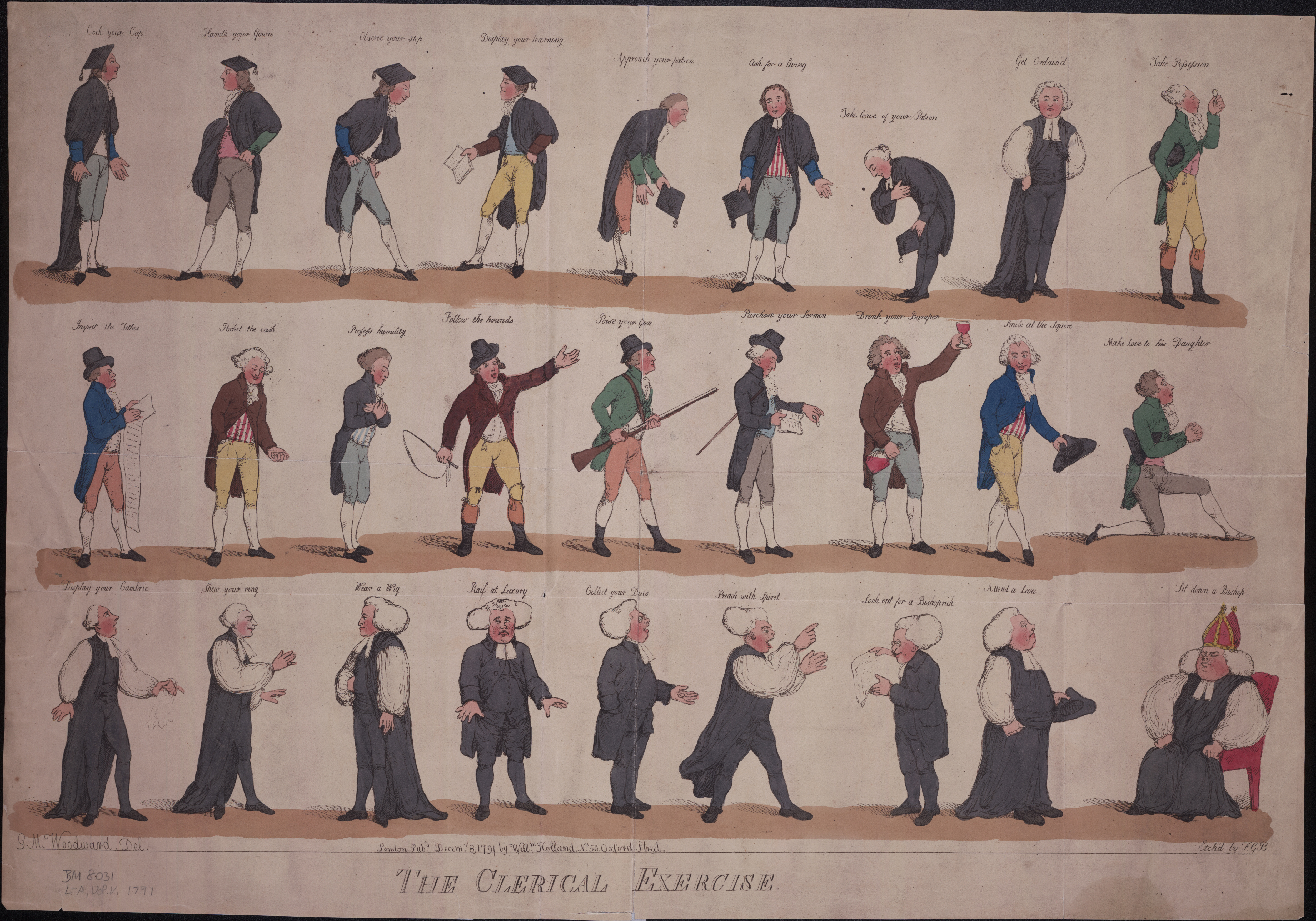 Mr. Collins, Mr. Elton, and Dr. Grant all reflect popular images of the clergy shown in George M. Woodward’s The Clerical Exercise (1791). In Woodward’s satire, a light variation on Hogarth’s earlier progresses, twenty-seven figures depict a clergyman seeking worldly advancement rather than serving God or the people he is supposed to shepherd. First, as a student at Oxford or Cambridge, the clergyman shows off his cap and gown and his learning. He then approaches his patron with a bow, asks for a living (a position as rector or vicar of a parish) with cap in hand, and, with a lower bow, takes leave of his patron. With a proud air, he is ordained and takes possession of his living. He inspects the tithes (his income), pockets the money, and professes humility.