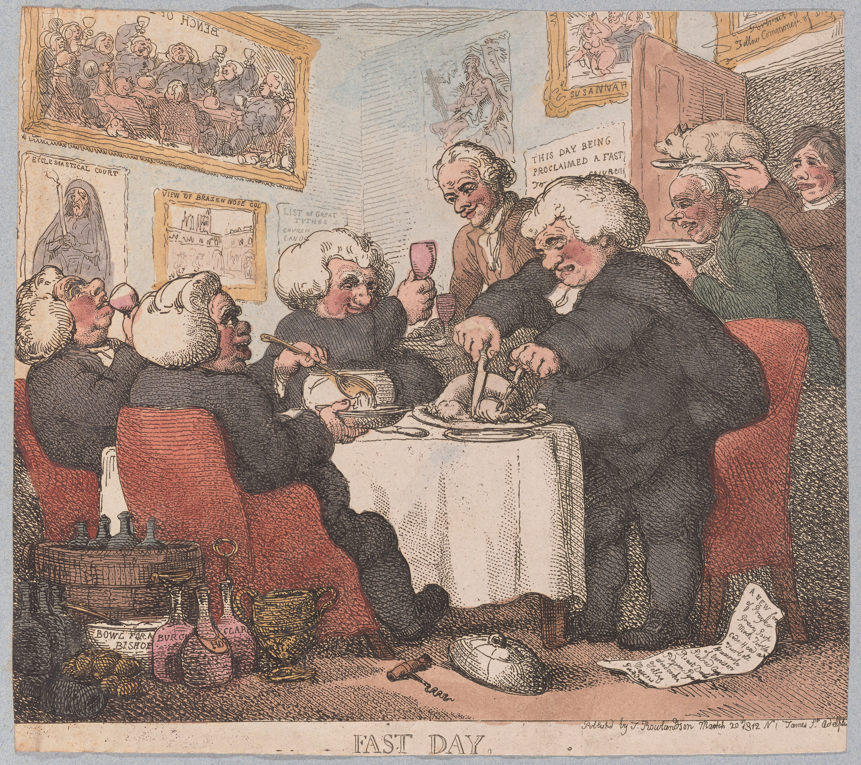 Many satirical cartoons, however, reflect this prevalent stereotype. Thomas Rowlandson’s print Fast Day (1799) shows a group of self-indulgent clergymen, like Dr. Grant, feasting on a church day of fasting. A paper on the floor, headed “A New form of Prayer,” lists culinary delicacies. A servant carries a pig into the room, no doubt representing the “tithe pig.”