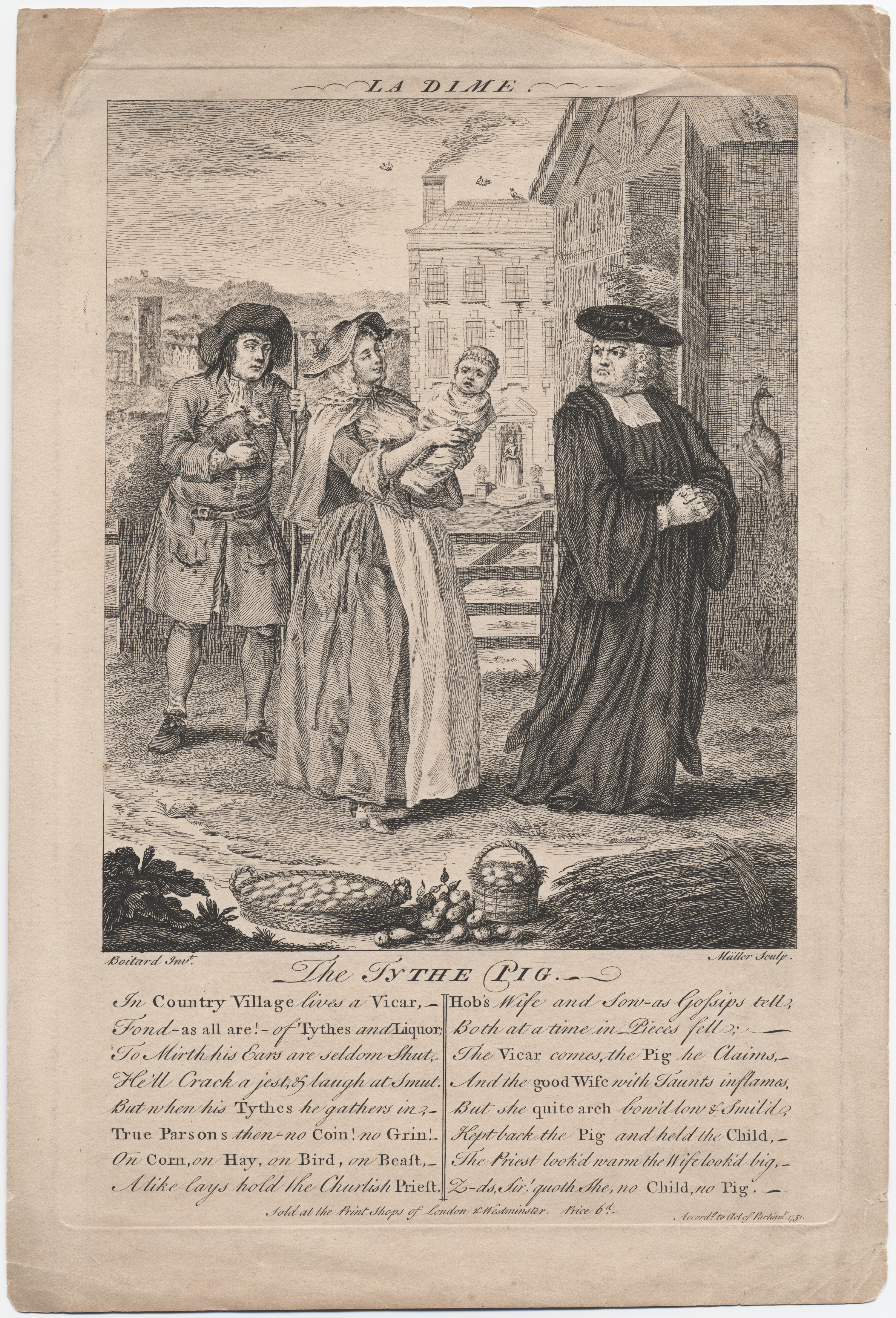 As represented in popular prints, such tithes could be a hardship for poor families. A 1751 satirical print by Louis Peter Boitard, The Tythe Pig, shows a scowling priest who has come to take a tithe pig—the tenth pig produced on a family’s farm. The wife tries to hand him a baby instead, saying, “no Child, no Pig”—they cannot afford to feed all their children if they give the clergyman the pig. This illustration and story were widely copied in the following decades, even appearing on mugs and as porcelain figurines.