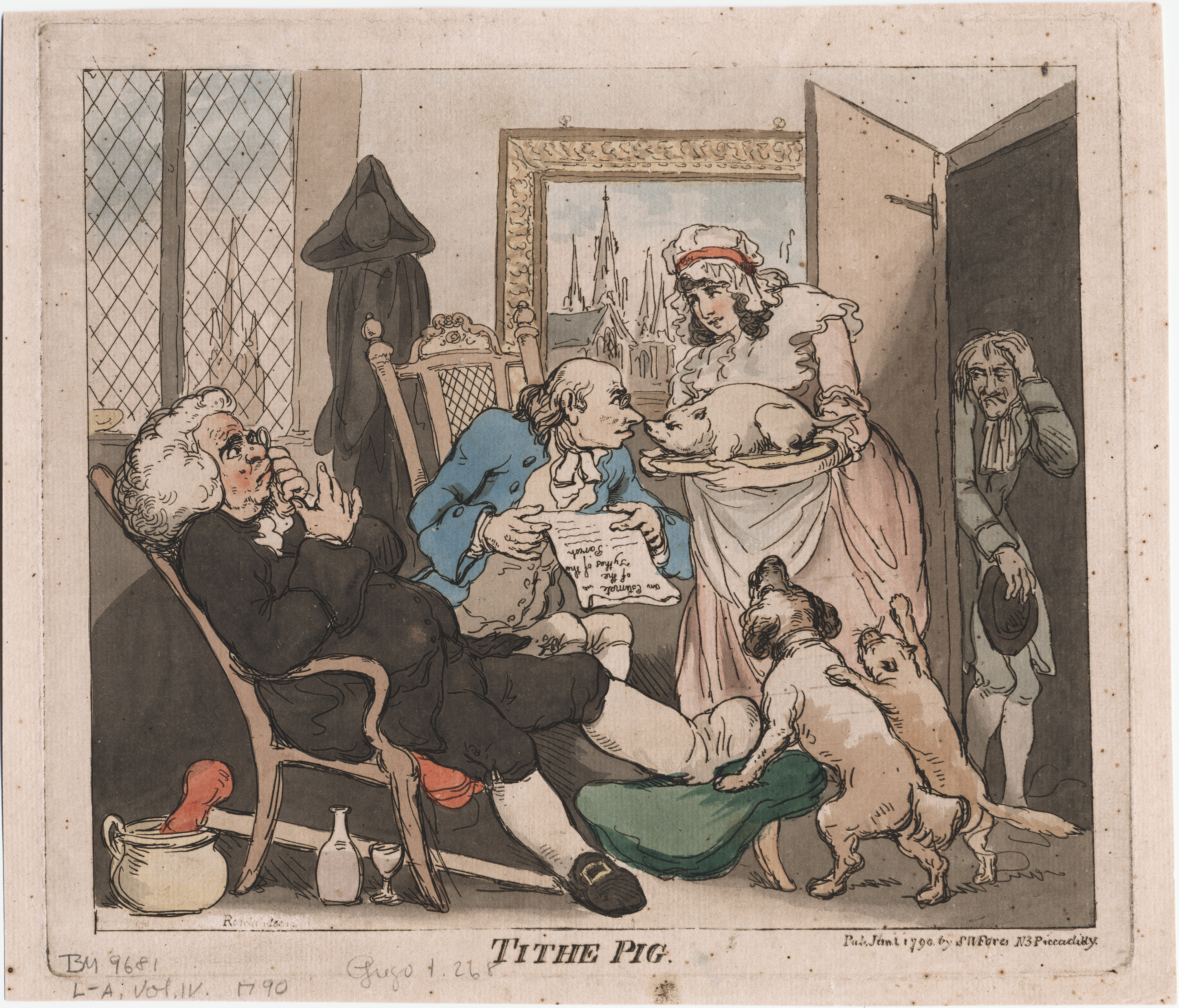 Clerical gluttony was often connected with tithes, which provided most of the clergyman’s income. (Revenue from glebe farmland belonging to the living and fees paid for services like weddings and funerals made up the rest.) People of a parish were legally required to pay their rector ten percent of their agricultural produce. This tithe might be paid in kind—pigs, chickens, wheat, eggs, etc.—or in equivalent cash (Collins, Clergy 49–50).