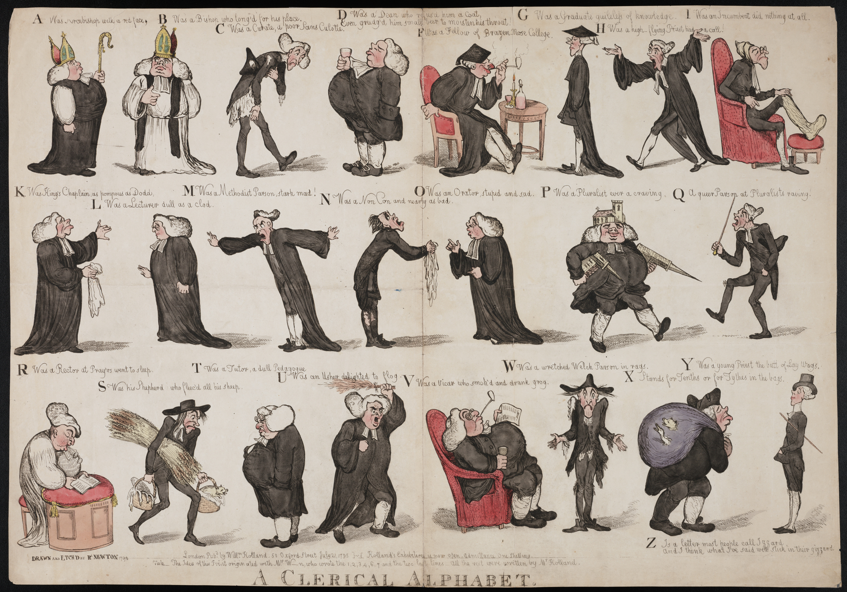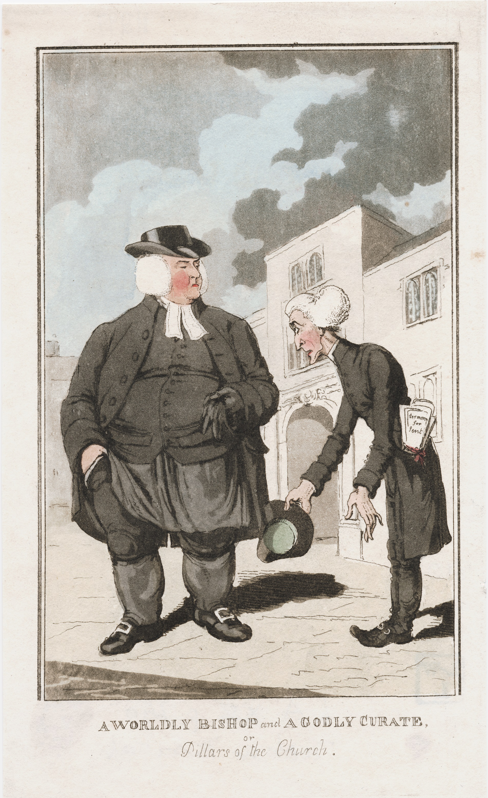 Jane Austen humorously satirized many aspects of English life, including the church and clergy. Austen’s novels all include clergymen, ranging from the conscientious heroes Henry Tilney, Edward Ferrars, and Edmund Bertram to self-centered Mr. Collins, socially ambitious Mr. Elton, and gluttonous Dr. Grant. Satirical cartoons of the time, like Austen’s portrayals of Collins, Elton, and Grant, illustrate popular perceptions of the clergy and many of the issues facing Austen’s Church of England. Jane Austen mentions such cartoons twice in her letters. In her novels, she sometimes reflects the same criticisms as the cartoons while at other times softening or even countering them.