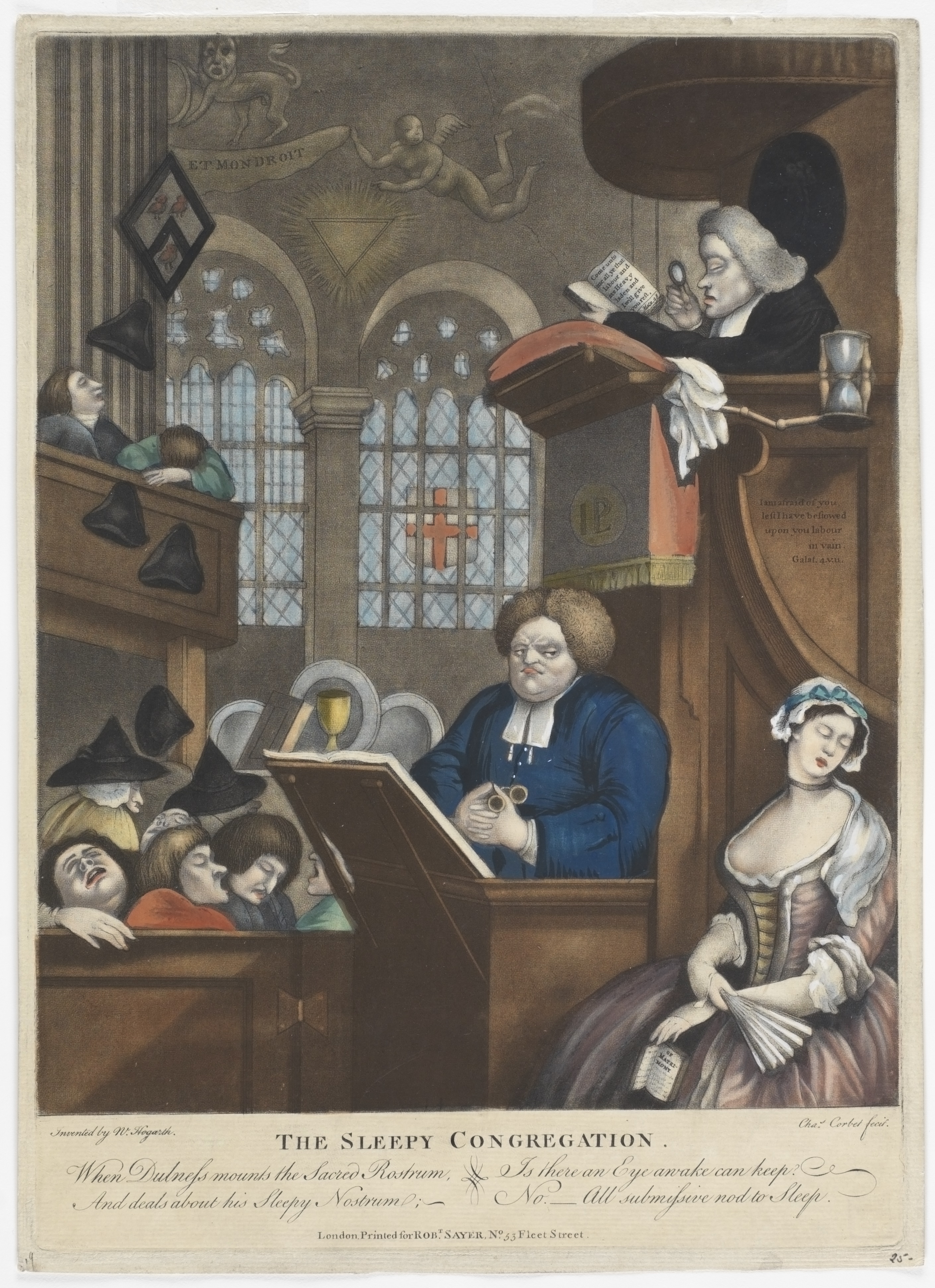 - _____. The Sleeping Congregation. London, 1736, 1762; https://findit.library.yale.edu/catalog/digcoll:4048579. [Also published as The Sleepy Congregation. Colorized by Charles Purcell, 1746–1766. https://findit.library.yale.edu/catalog/digcoll:551364]