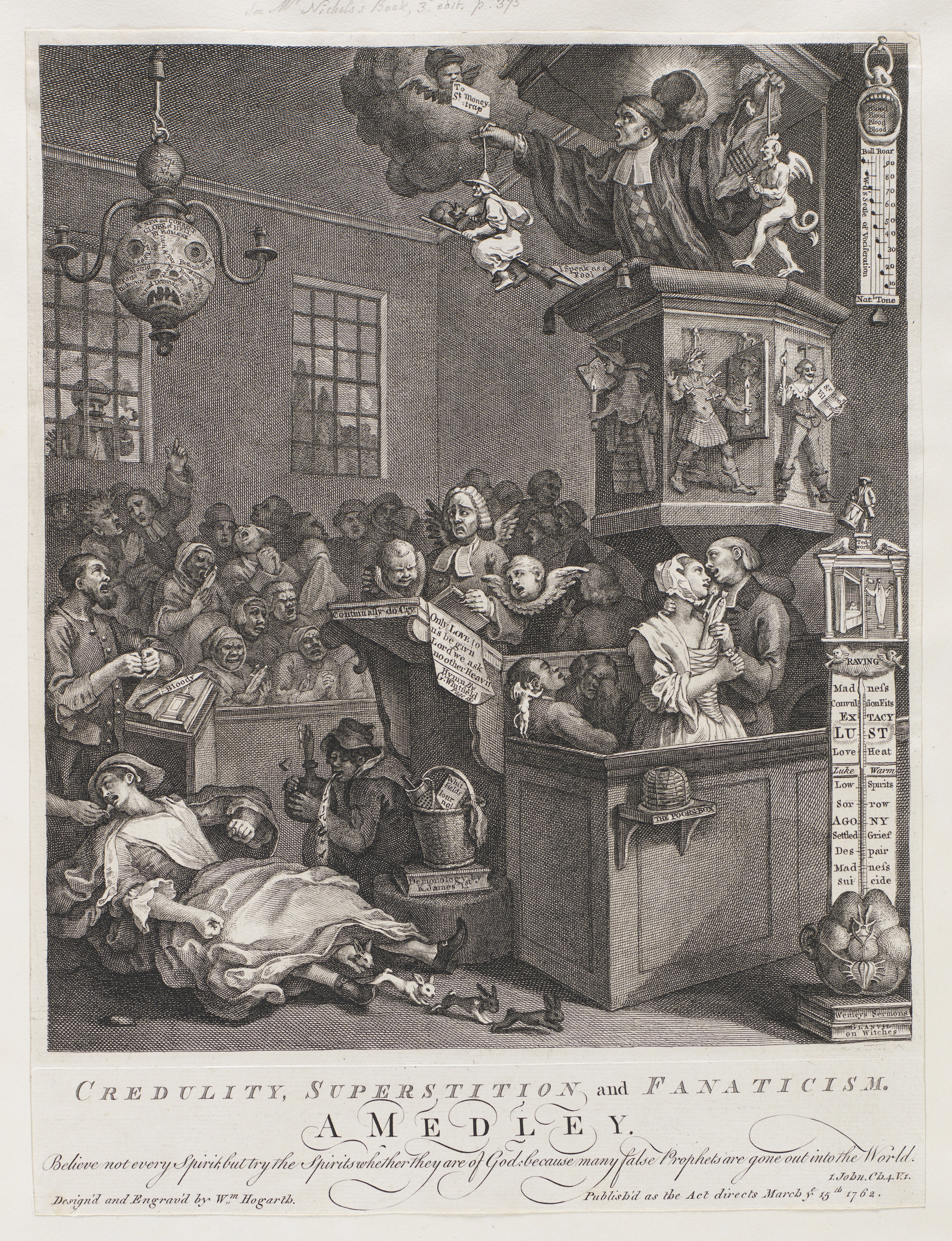 - Hogarth, William. Credulity, Superstition, and Fanaticism. London, 1762. [Earlier version: Enthusiasm Delineated, 1761.] https://findit.library.yale.edu/catalog/digcoll:5240469