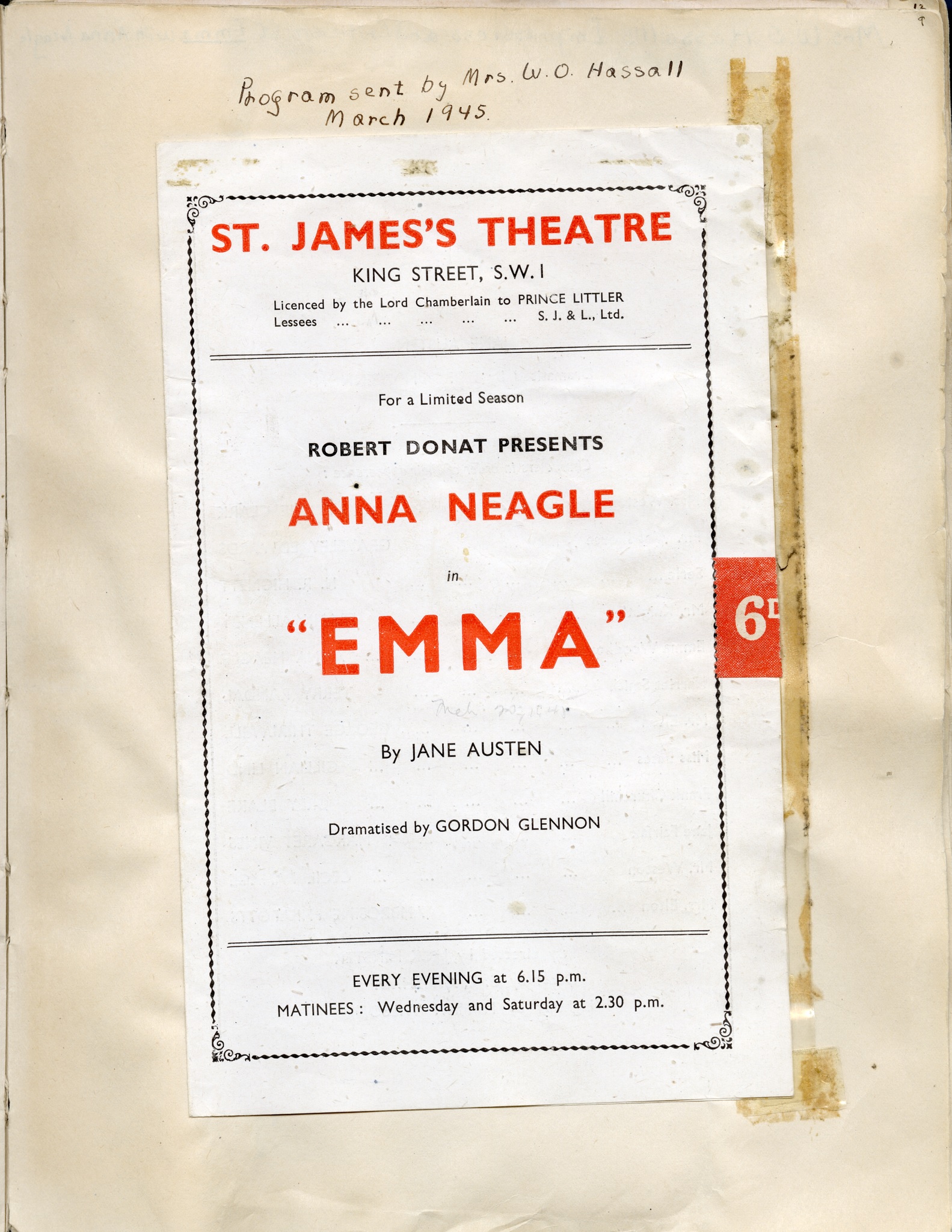 Averil’s profound sympathy with Alberta’s capacious approach to collecting is evident in her first extended contribution to her friend’s growing archive: documents concerning a new dramatization of Emma by Gordon Glennon, which premiered at the St. James’s Theatre in London in February and March 1945.4 The relative renown of the playwright and the lead actress can be gauged from the playbill, which credits Glennon (and Austen) in very small black type, while Anna Neagle’s name jumps out in big red type. While a comprehensive history of Austen plays has yet to be written, Glennon’s seems to have been the first ever professional dramatization of Emma, and only the second Austen adaptation to reach the London stage. (Helen Jerome’s successful Pride and Prejudice play was performed in New York in 1935 and in London in 1936.5)