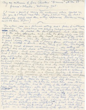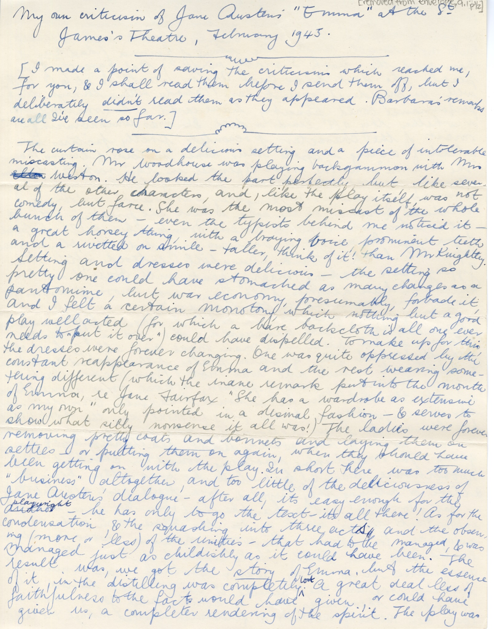 Because World War II prevented Alberta from traveling to London to attend Glennon’s Emma in person, Averil gathered as much information as she could to satisfy her friend’s curiosity. She clipped reviews in the London Times, London Observer, and Times Literary Supplement, as well as a performance photograph published in the Times. The crowning glory of Averil’s dossier was a multi-page handwritten response, which she titled “My own criticisms of Jane Austen’s ‘Emma’ at the St James’s Theatre, February 1945.6