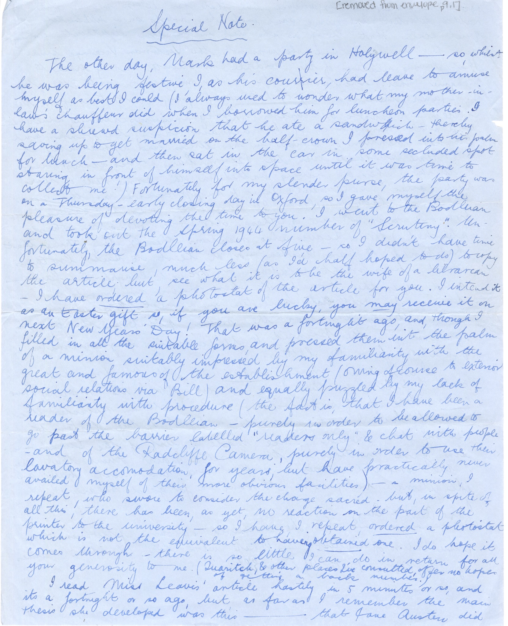 The other day, Mark [Averil’s middle son, who donated Alberta’s letters to Goucher] had a party in Holywell [a street in central Oxford]—so, whilst he was being festive, I, as his courier, had leave to amuse myself as best I could. . . . [T]he party was on a Thursday—early closing day [for shops] in Oxford, so I gave myself the pleasure of devoting the time to you. I went to the Bodleian and took out the Spring 1944 number of “Scrutiny.” Unfortunately, the Bodleian closes at five—so I didn’t have time to summarise, much less (as I’d half hoped to do) to copy the article, but, see what it is to be the wife of a librarian—I have ordered a photostat of the article for you. I intend it as an Easter gift so, if you are lucky, you may receive it on next New Year’s Day! That was a fortnight ago, and, though I filled in all the suitable forms, and pressed them into the palm of a minion suitably impressed by my familiarity with the great and famous of the establishment (owing of course to exterior social relations via Bill) and equally puzzled by my lack of familiarity with procedure (the fact is, that I have been a reader of the Bodleian—purely in order to be allowed to go past the barrier labeled “readers only” & chat with people—and of the Radcliffe Camera [a reading room of the Bodleian], purely in order to use their lavatory accommodation, for years, but have practically never availed myself of their more obvious facilities)—a minion, I repeat, who swore to consider the charge sacred—but, in spite of all this, there has been, as yet, no reaction on the part of the printer to the university—so I have, I repeat, ordered a photostat which is not the equivalent to having obtained one. I do hope it comes through—there is so little I can do in return for all your generosity to me. (Quaritch [a dealer in rare books], & other places I’ve consulted, offer no hope of getting a back number.)