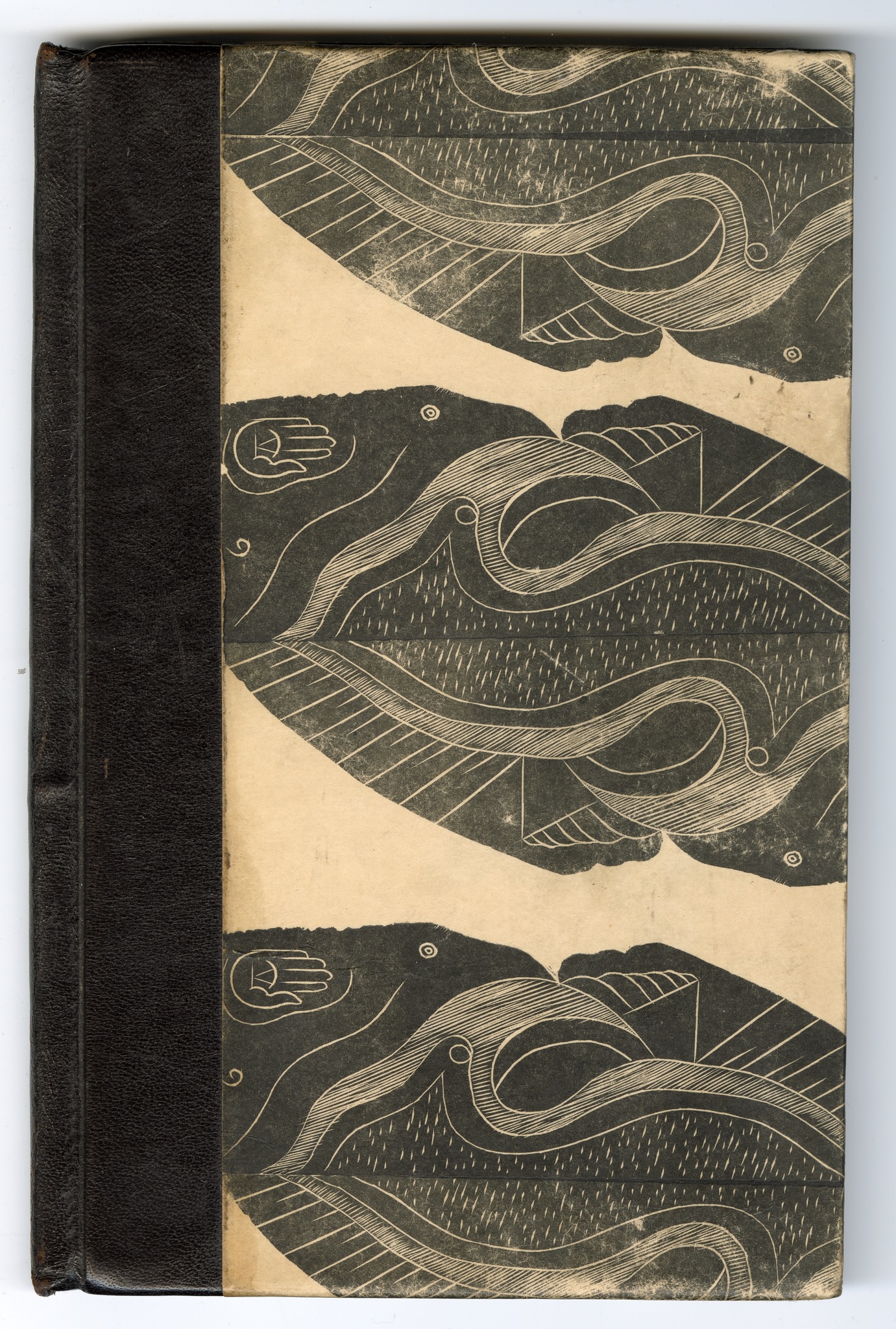 A white-on-black photostat of the Leavis article is indeed in Alberta’s collection, in a most unusual form: a handbound book covered in Averil’s own abstract artwork and with a hand-calligraphed title page. As Averil explained in an accompanying postcard, “I’ve just parceled up your unique copy of the Spring number 1944 of the Jane Austen article in Scrutiny. The cover is a wood block print of my own—not surrealism, or symbolism, or any other ism but just what happens when I’ve a tool in my hand, and am trying to see what it will do!”13