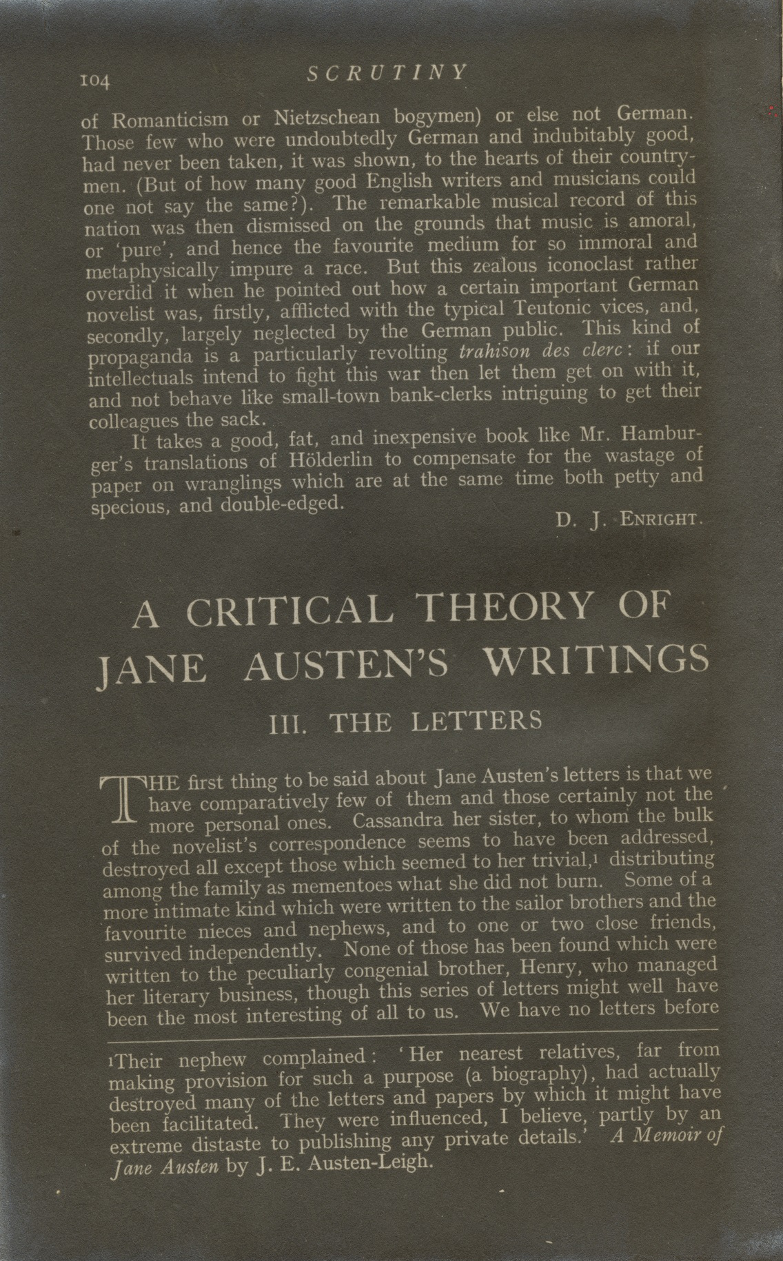 The article that Averil tracked down, skimmed, ordered for duplication, and ably summarized was the final installment of Q. D. Leavis’s set of three articles, collectively titled “A Critical Theory of Jane Austen’s Writings,” which were published in the journal Scrutiny from the June 1941 to Spring 1944 issues. (D. W. Harding’s influential essay “Regulated Hatred: An Aspect of the Work of Jane Austen” had appeared in the March 1940 issue of Scrutiny.)