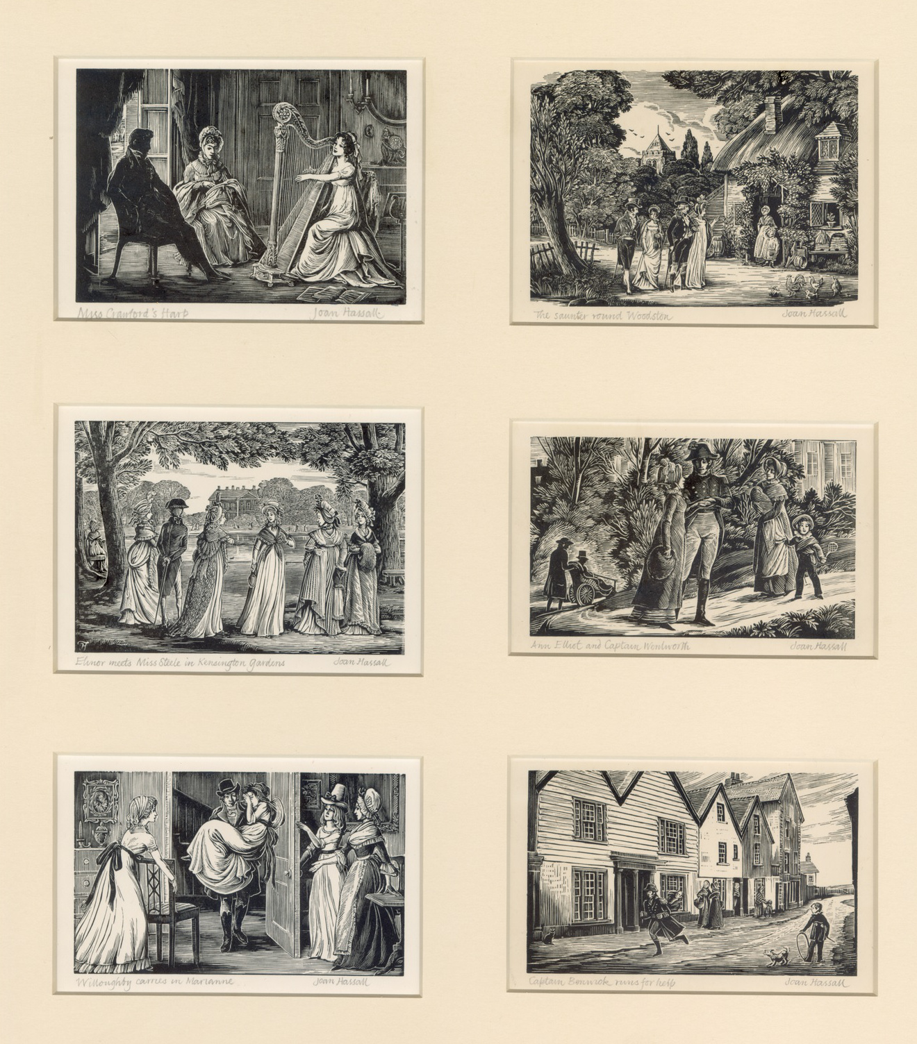 Figure 20. Signed prints of illustrations by Joan Hassall: “Miss Crawford’s Harp,” “The saunter round Woodston,” “Elinor meets Miss Steele in Kensington Gardens,” “Ann [sic] Elliot and Captain Wentworth,” “Willoughby carries in Marianne,” “Captain Benwick runs for help.”