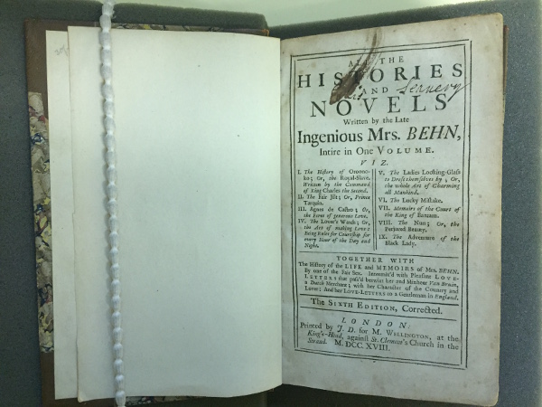 Aphra Behn. All the Histories and Novels Written by the Late Ingenious Mrs. Behn, Intire in One Volume. Sixth edition. London: JD for M. Wellington, 1718. (Chawton House Library Collection)