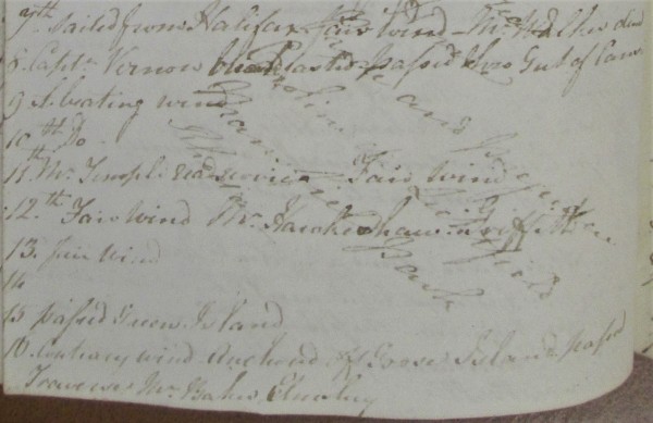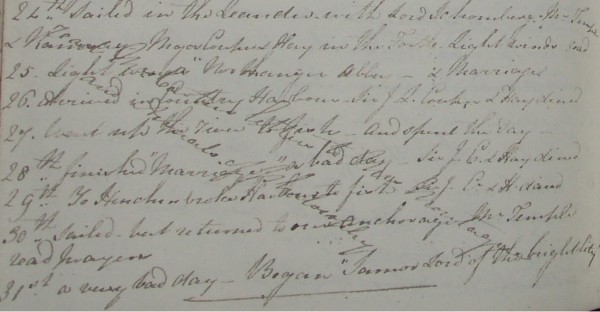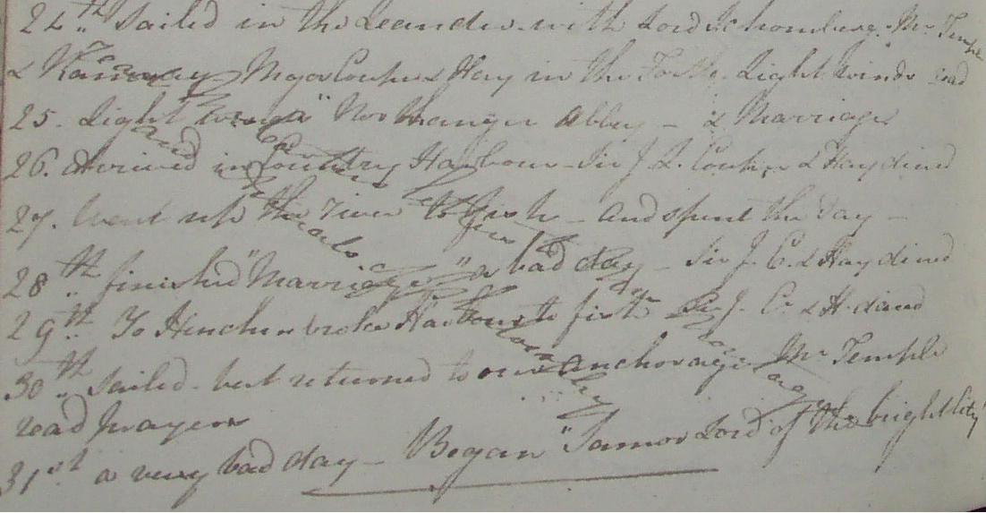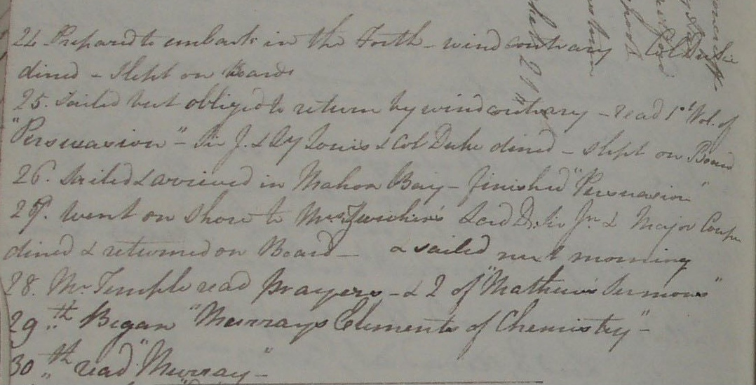 Given all these obstacles, it is remarkable that Lady Dalhousie’s reading of several Austen novels can be discerned. Her earliest record is for Persuasion, of which she read the first volume on June 25, 1818, and which she finished on June 26th. Her speedy reading was aided by her circumstances: she was on board a ship, the Forth, which was endeavoring to sail from Halifax to Mahone Bay (the countess spelled it “Mahon”). With the “wind contrary,” the passengers “slept on Board” until they could sail successfully on the 28th. The delightful coincidence of reading Persuasion while onboard a ship—even a stationary one—needs no explanation. Listed on the same diary page are other titles that accurately represent Lady Dalhousie’s range of reading, including “Mathews Sermons” and “Murrays Elements of Chemistry.”