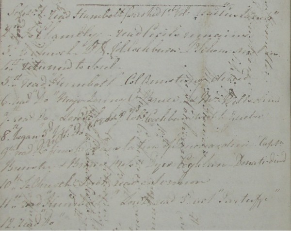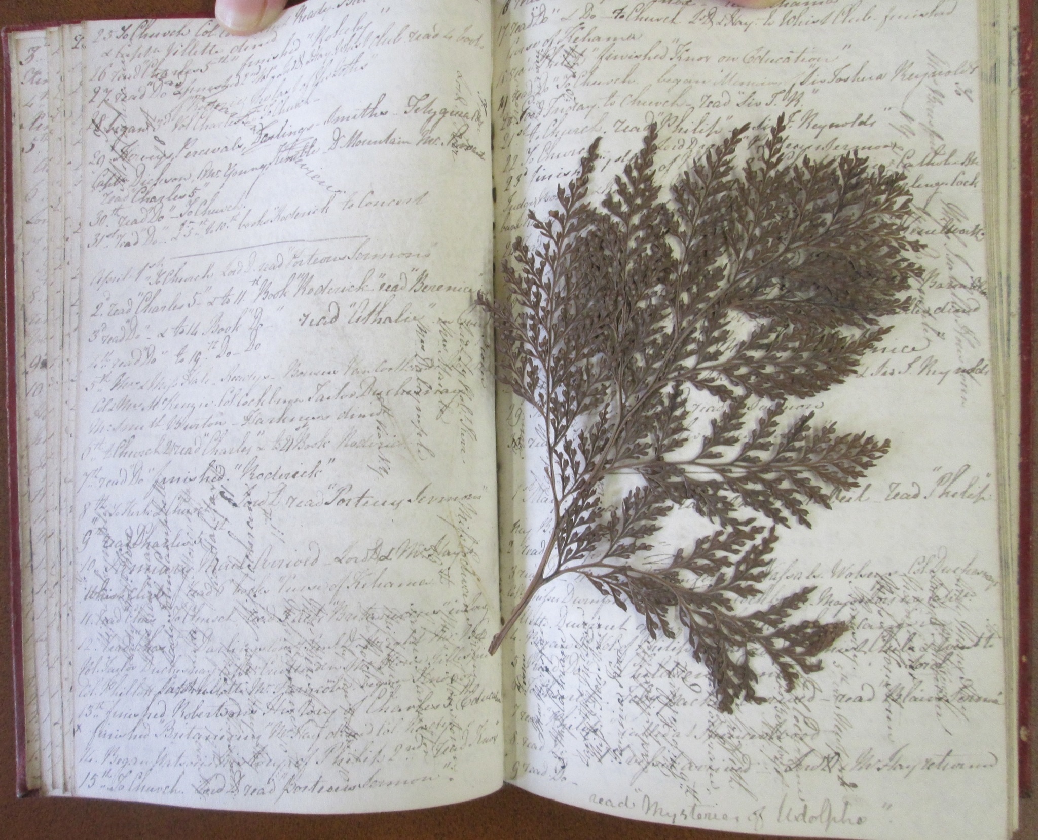 What Lady Dalhousie read and when is easy to track, in theory, thanks to her habit of listing her day’s reading in her diaries, along with plays attended, visitors hosted, and travel undertaken. While her handwriting is generally very legible, her North American diaries can nevertheless be quite challenging to decipher. Not only did she cross-hatch her pages to keep track of letters received and letters sent, but she sometimes listed titles read diagonally as well as horizontally. Furthermore, she maintained her lifelong habit of inserting plant specimens and other finds into her diaries, some of which have left significant “shadows” on facing pages. In some of her diaries, too, faded or degraded ink has made her entries very faint.