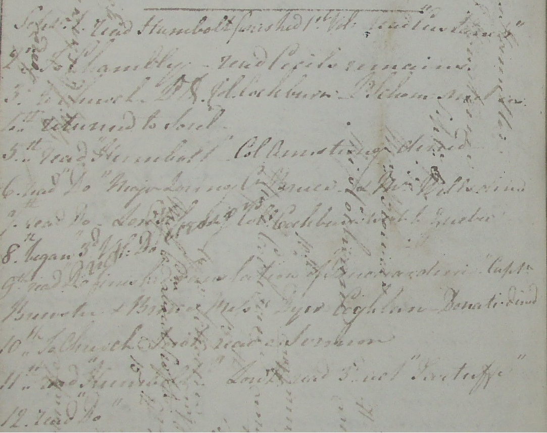 But what of Emma? My repeated scrutiny of Lady Dalhousie’s diary pages has yielded no definite entries. In a letter to a friend, she mentioned that she did a great deal of reading during the month of September 1820, while staying at the country retreat of Sorel, outside Quebec (to Mrs. Anderson, 26 September 1820). Her 1820 diary pages, however, are especially faint and hard to read; a short word like Emma could easily disappear. A particularly illegible diagonal entry opposite her entries for September 8 and 9 may possibly contain a note for Emma.