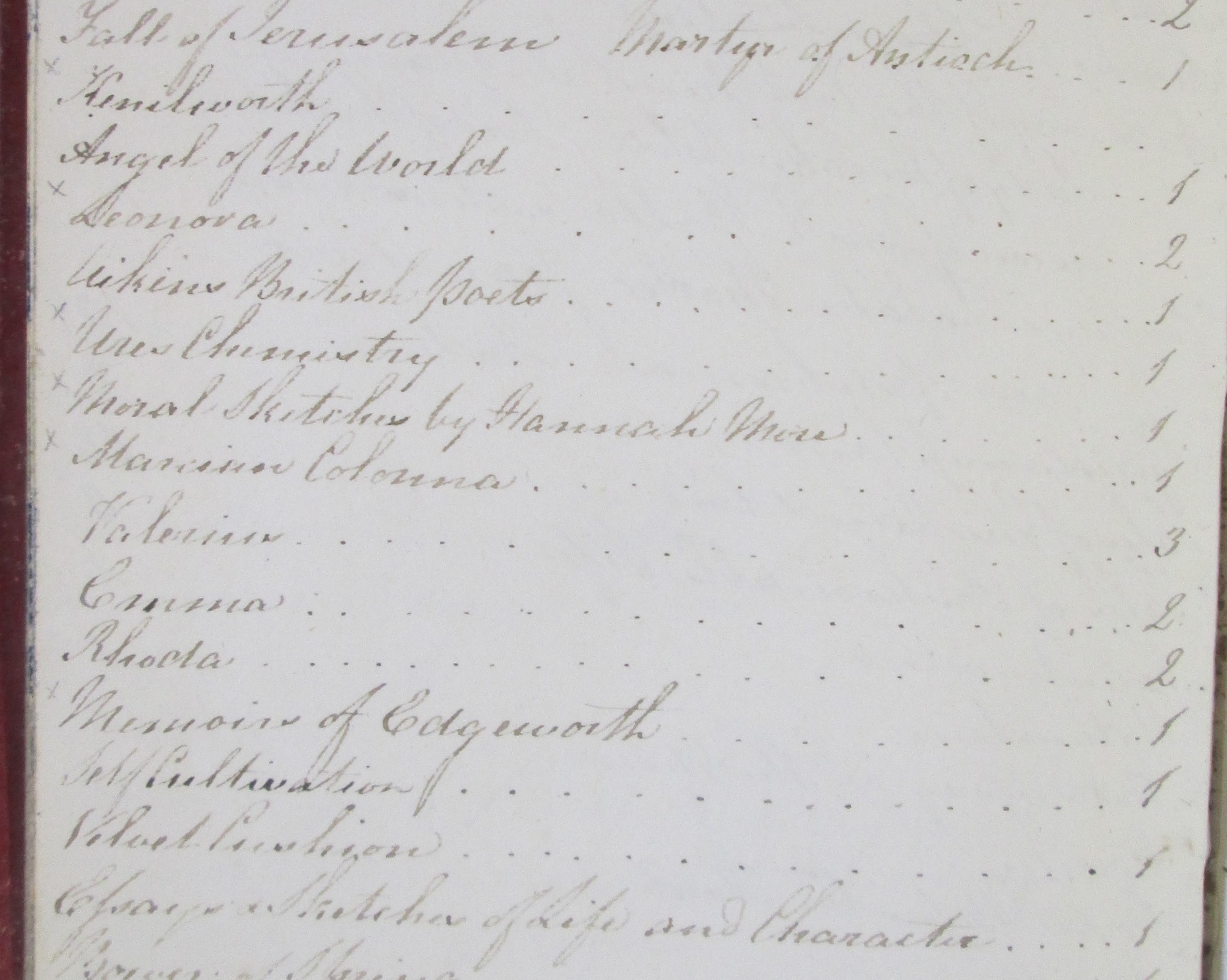 The likelihood of the countess having read Emma in 1820 is substantiated by her inclusion of it on a 141-item list of books on the back pages of the diary volume she began on September 1, 1819. Apparently drawn up in preparation for the Dalhousies’ move to Quebec in June 1820, the list includes the number of volumes per title: “2” in the case of Emma. While the list begins in alphabetical order, the last third of the entries are not alphabetized, implying that the countess added those latter entries in the order in which she acquired the books. Several of the titles surrounding Emma can be cross-referenced with the countess’s diary entries from June 1820 to November 1821.