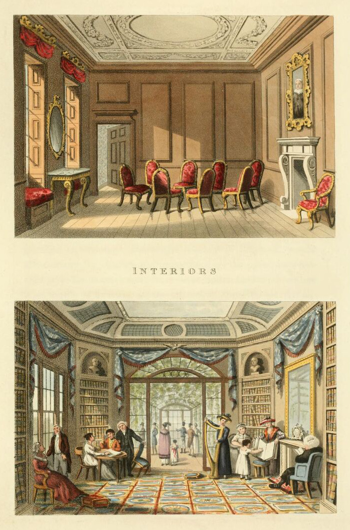 In using the term “Cedar Parlour,” Repton refers to the fact that throughout the baroque era, in the seventeenth century, rooms were commonly lined with wood wainscoting or paneling. Oak was most frequently used, but cedar and other woods were installed as well (Beard 85–86). In fact, in Austen’s favorite novel, Samuel Richardson’s Sir Charles Grandison, the cedar parlor in Selby House is the favorite room of Harriet Byron. James Edward Austen-Leigh remarked that his aunt knew “Every circumstance narrated in [Richardson’s novel], all that was ever said or done in the cedar parlour, was familiar to her” (qtd. in Southam 9). Wainscoting provided an attractive background for paintings, like the Musgroves’ “portraits against the wainscot” in their “old-fashioned square parlour” and the portrait above the mantel in Repton’s illustration.