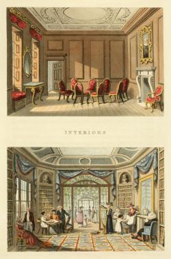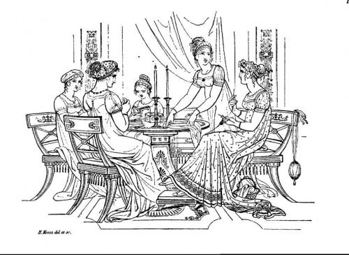 Eventually, a desire for a more relaxed way of life led to the practice of furniture being permanently placed away from the walls in clusters around the room (Thornton 147). Repton’s living room reflects this new practice. People are seated on a miscellaneous selection of chairs, “scattered in groups,” as Repton says, as they take part in a variety of activities, such as conversing, playing the harp, and reading alone and together. The narrator of Persuasion portrays the sociable atmosphere of the Musgroves’ parlor at Christmas time: “On one side was a table, occupied by some chattering girls, cutting up silk and gold paper; and on the other were tressels and trays, bending under the weight of brawn and cold pies, where riotous boys were holding high revel” (145). Observing this scene, Mrs. Musgrove appreciates the “little quiet cheerfulness at home” (146).5 This depiction brings to mind Repton’s living room, where “discords twanging from the half-tun’d harp / Make dulness cheerful, changing flat to sharp.”