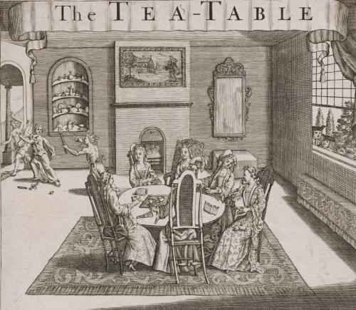 In a baroque-era parlor, the standard location of furniture was against the wall, but it could be moved around as needed for different activities. A print from 1766 shows a tea table and chairs placed onto a “small carpet” surrounded by a “shiny floor.” In Repton’s cedar parlor, a group of chairs has been set in a “formal circle” in the middle of the room. This placement indicates that all of the people seated there would have been taking part in the same discussion, an arrangement that could have a deadening effect on conversation. As Robin Evans has commented, the interaction in Repton’s room would have been “obsequiously directed by one elderly and overbearing figure, the matriarch, whose domineering presence was symbolized by the portrait on the wall” (215). A passage from December 1782 in the diary of Frances Burney demonstrates that even by that time some people were trying to avoid “the circle.” Burney describes a visit to a fashionable home in London, where the hostess said, “‘My whole care is to prevent a circle.’ Rising hastily, the lady then pulled about the chairs, and planted the people in groups with as dexterous disorder as you would desire to see” (qtd. in Thornton 149).