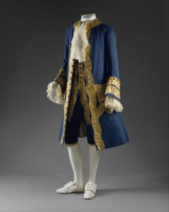 Men’s suits of the rococo era were cut full and could be heavily embellished with trim. An example from about 1760 has a long waistcoat (vest) covered by a knee-length coat with wide cuffs and a flaring skirt that emphasizes the lower torso. Men generally shaved their heads and wore wigs, sometimes powdered white.