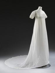 A few decades after the style had become the norm in furnishings, neoclassicism entered the realm of fashionable dress. The attire of the turn of the nineteenth century employed less elaborate silhouettes and fabrics than had been used for hundreds of years. The goal of fashion had been to distort the body’s natural shape with the use of copious amounts of expensive fabric to indicate plenty, wealth, power, and prestige (Ribeiro and Cumming). At the end of the eighteenth century, however, there was a zeal for ancient Greek and Roman styles. This taste, combined with the break that came with the old order as a result of revolutions in America and France, encouraged those like Henrietta and Louisa, who were “living to be fashionable,” to leave behind what they saw as the frivolous and over-luxurious styles of their predecessors in the “old English style.”6 The transformation was dramatic: a woman who had attended a ball at George III’s court wearing an embroidered silk dress with wide skirts might later attend a ball at the Assembly Rooms at Bath wearing a thin white cotton muslin one.7
