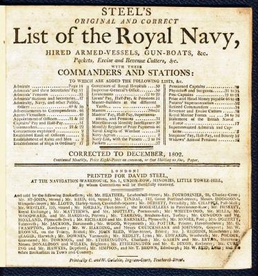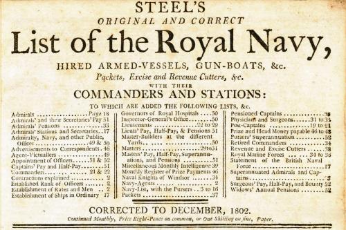 Steel, a nautical bookseller in London, had recognized a demand for up-to-the-minute information about Royal Navy ships and personnel. His unofficial lists appeared from 1780 to 1816 and proved a popular and invaluable resource throughout the wars with France and America. The earliest productions were little more than thin pamphlets, comprising an inventory of ships with the number of their guns, the names of their commanders, and an indication of whether the vessels were in commission, out of service, or under construction. By the 1790s, the lists also gave the locations of home and foreign stations, a record of vessels taken by or from the enemy, the identity of officers who had perished in the service of their country, the launch or acquirement date of each ship, and the names of the Lords of the Admiralty, Commissioners of the Navy and Navy agents, post captains, commanders, lieutenants, masters, surgeons, and officers of the Royal Marines. During the wars with France and America, Steel’s list appeared at the beginning of every month. Although unofficial, Steel’s list was accounted both accurate and trustworthy. It was not until the beginning of 1814 that the Admiralty itself began producing anything comparable, issued from Albemarle Street in London by Jane Austen’s publisher, John Murray.