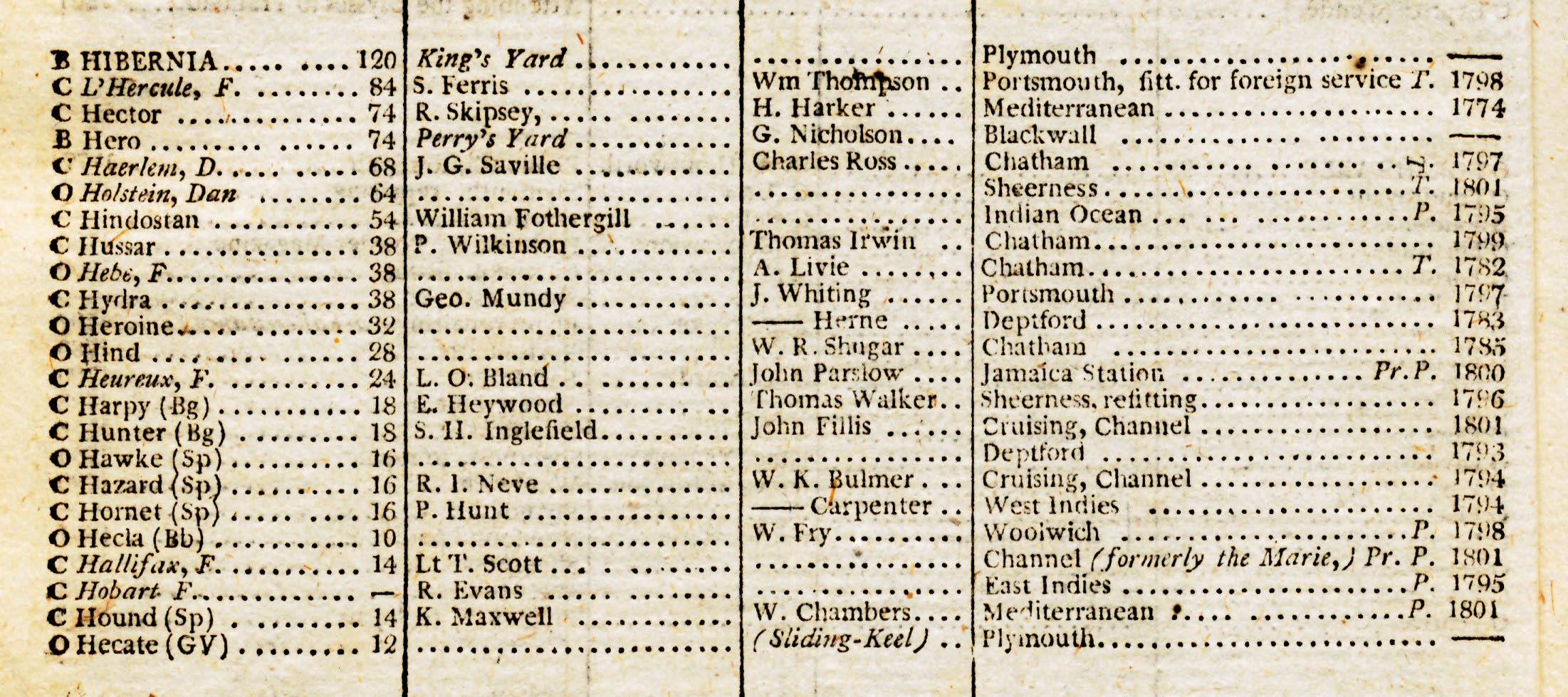Steel’s list denoted class with a series of letters: C for commissioned, or in service at sea; O for “in ordinary” or non-commissioned, that is, out of service in port; B for building; and T for taken from the enemy.
