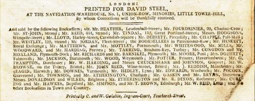 From where did the Musgroves buy their navy list? Fifty booksellers are named at the foot of the cover, a number of whom were based in London, but the majority operated in coastal towns such as Portsmouth, Dartmouth, Harwich, Lynn, Yarmouth, and Brighton. The closest supplier to Uppercross, and indeed to Kellynch, is Mr. G. Frampton in Dorchester, although “other Booksellers in Town and Country” also sold Steel’s.