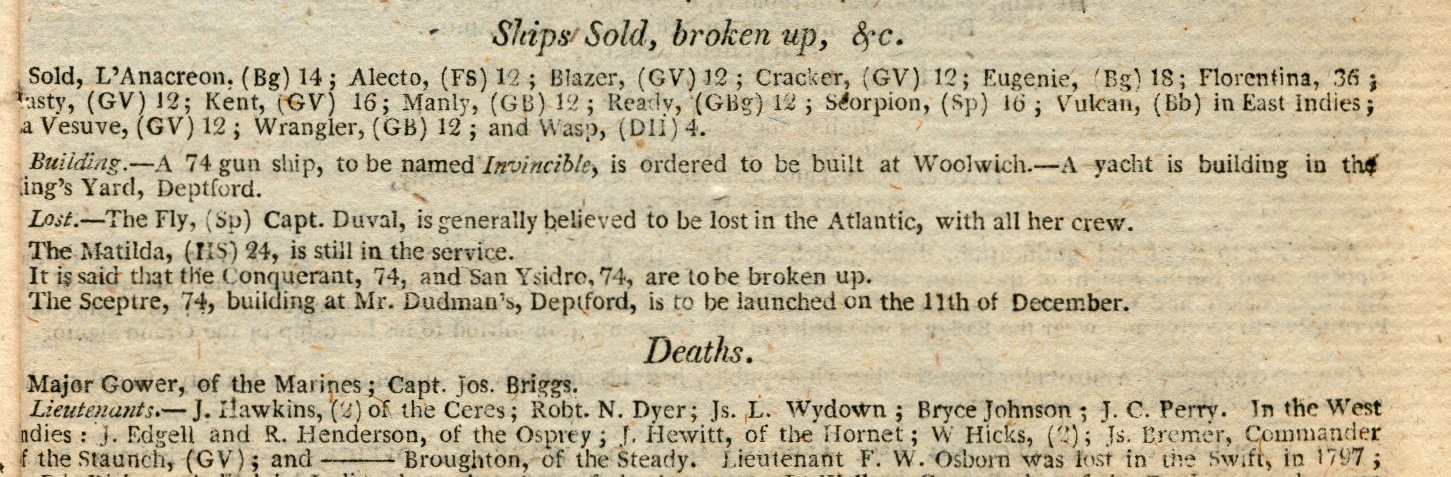 In the “Monthly Miscellaneous Intelligence” section for December 1802 is the heading Ships Sold, broken up, &c. One of these is the sloop Scorpion, on which Charles Austen served for two years as a lieutenant, until 1798. In Anne Elliot’s copy of a list in 1808 or thereabouts, she might have seen Captain Wentworth’s worn out Asp in this section. Had Wentworth’s luck not held and the Asp been caught in the storm off Plymouth, his death would have been recorded in a short paragraph beneath the sad fate of various defunct ships. Under Lost in the 1802 list, the Fly, a sloop like the Asp, did not survive to be broken up; her unlucky commander, “Capt. Duval, is generally believed to be lost in the Atlantic, with all her crew” (39). A longer, but even less detailed, roll call of dead officers appears under Deaths.