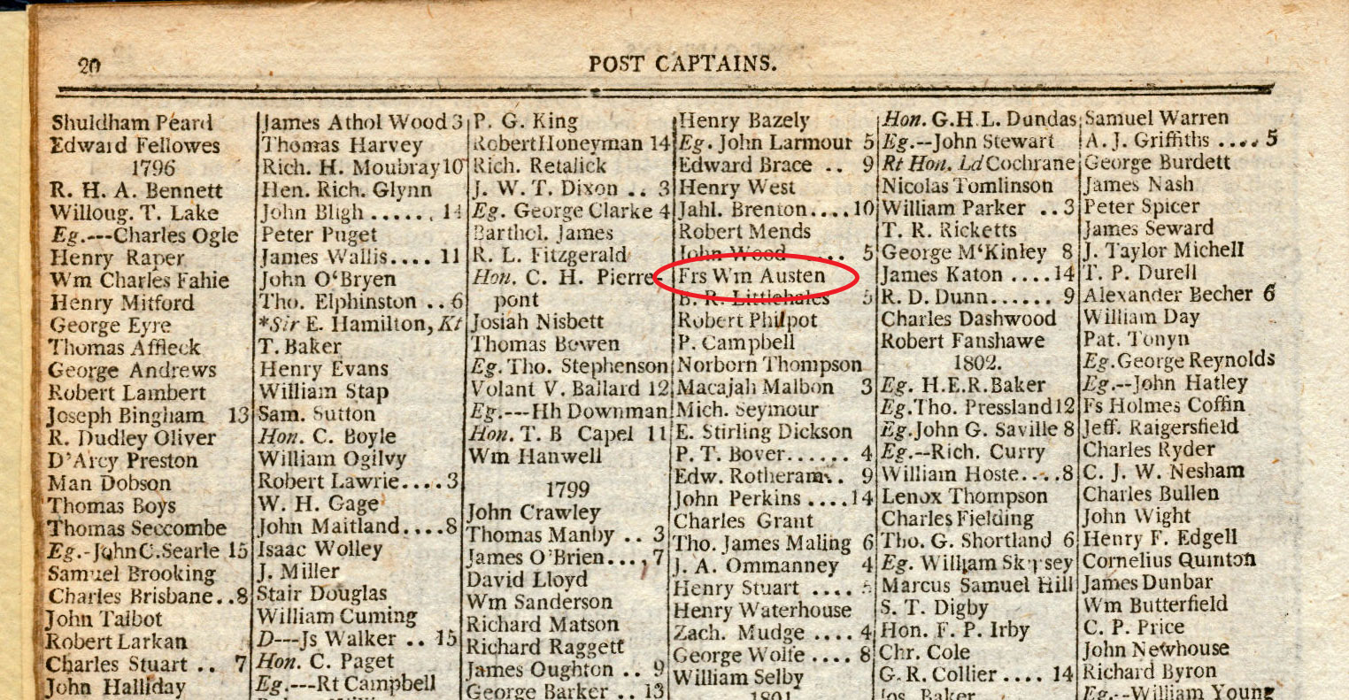 In the autumn of 1806, an angry Frederick Wentworth takes himself off to sea, leaving Anne Elliot with no means of following his postings and promotions over the next eight years, apart from the pages of newspapers and navy lists. Unlike many women with loved ones on board ship, Anne could expect no letters and no recent intelligence from fellow officers returning from action, but she could depend on two publications, Steel’s Original and Correct List of the Royal Navy and the Naval Chronicle, to provide accurate information. A keen reader of contemporary prose and poetry, Anne cannot be censured, as is Mr. Price in Mansfield Park, for a narrow interest in “only the newspaper and the navy-list” (450), but a close perusal of both give her an unquestionable “authority” on naval matters.