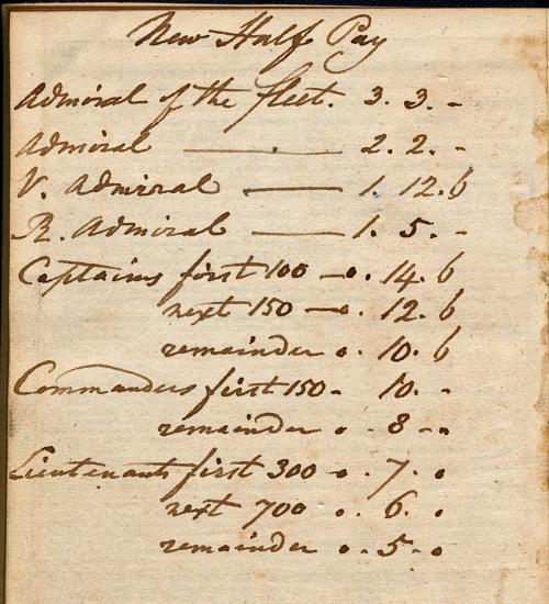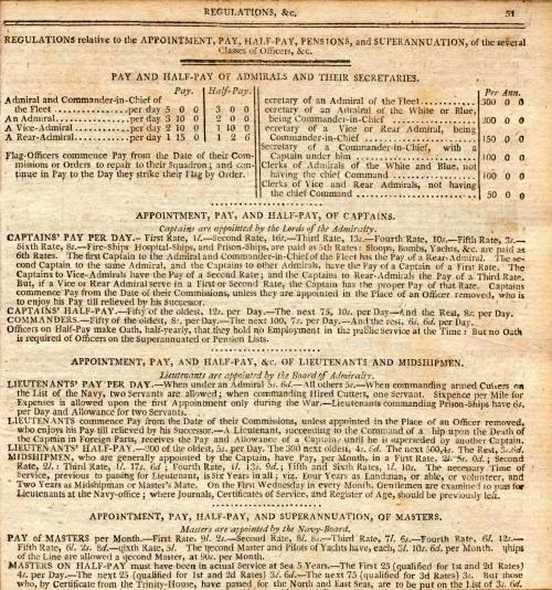 The final pages of Steel’s 1802 list deal with rates of pay for the various ranks, from admirals down to pursers.