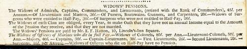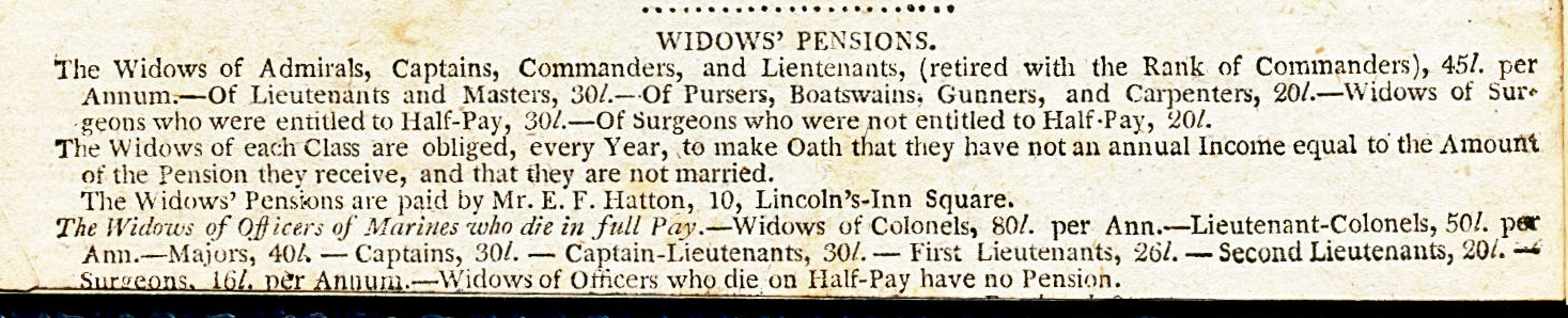 It is understandable that, deprived of the opportunity to win prize money and with little hope of promotion into dead men’s shoes, naval men on half pay should talk of “‘bad times for getting on’” (P 186) or offer up a toast for “A bloody war or a sickly season” (Southam 71). And much as they might appreciate having their husbands safe at home, naval wives had to pray for a resumption of full service and full pay, consequently suffering “the tax of quick alarm” faced by Anne Elliot (P 275). Steel’s very last section covers widows’ pensions for the different ranks, none of the amounts enough to keep body and soul together. Yet each year, the bereaved women had to state on oath that they were not in receipt of an income more than the amount of the pension.