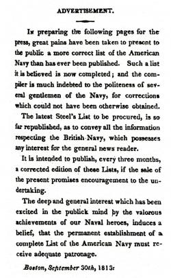 The Preface set out the publishers’ ambition to provide quarterly editions of “a more correct” version of the American navy list than had ever been attempted before and ended with the hope that “the permanent establishment of a complete list of the American Navy must receive adequate patronage” (3).