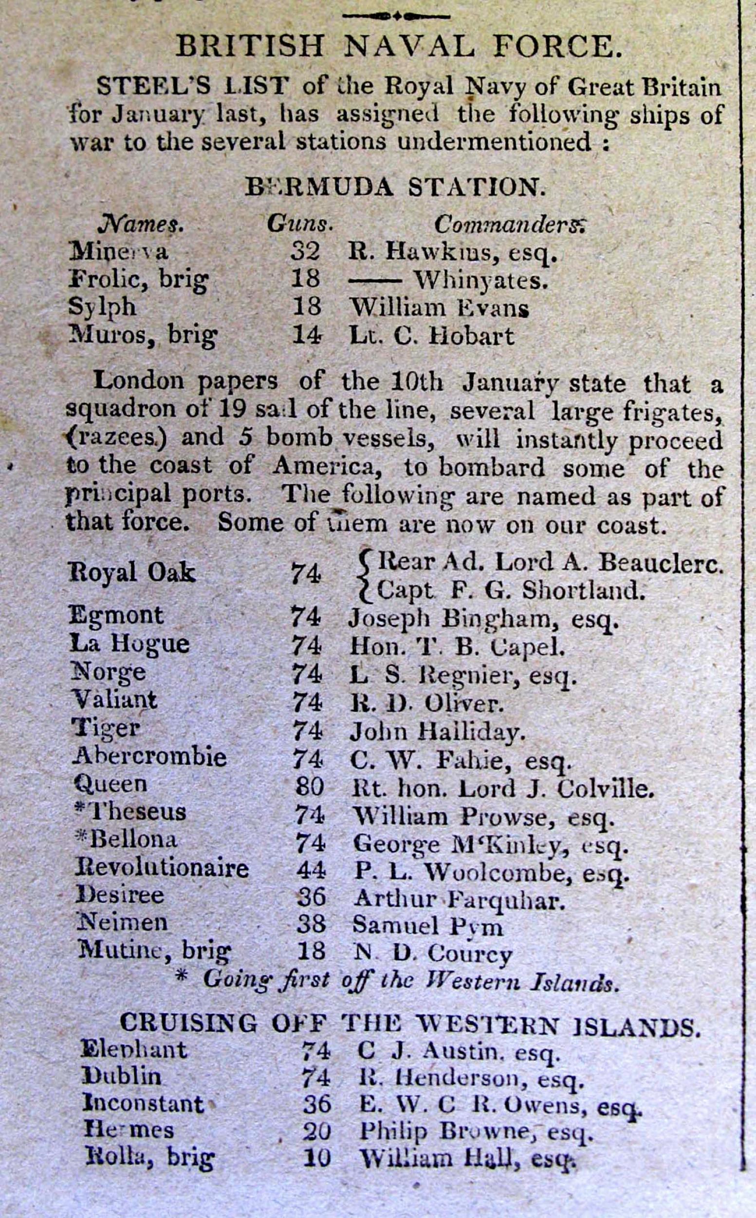 The first edition of a periodical called The War, published in New York and dedicated solely to the conflict, came out on June 27, 1812, a week after hostilities opened.3 Subscribers paid $2 per annum in advance for weekly editions, carrying reports of British and American ships taken or destroyed, naval and military promotions, prize money, deaths in service, and the location of enemy ships. On Tuesday, April 13, 1813, under the heading “British Naval Force,” The War reported, “Steel’s List of the Royal Navy of Great Britain for January last, has assigned the following ships of war to the several stations undermentioned” (182), and went on to catalogue the force dispatched from England to the Bermuda station and other coastal areas, plus those ships assigned to the Western Islands.