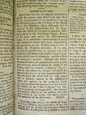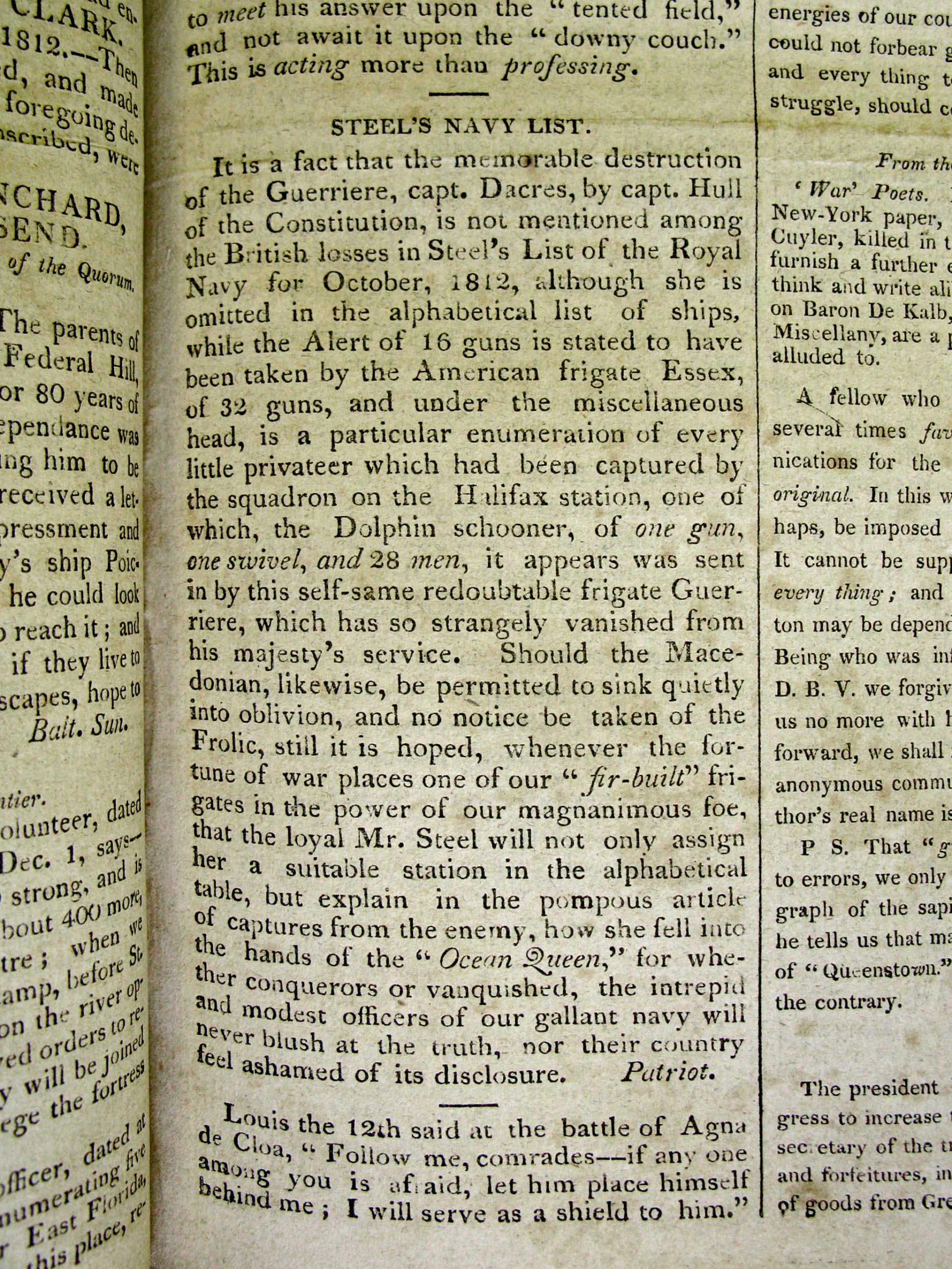 Inaccuracies in the compilation of Steel’s lists did not escape American censure. In an article dripping with sarcasm, The War of Saturday, January 16, 1813, criticized “the loyal Mr. Steel” (who had in fact died in 1803) for being economical with the truth in failing to report the destruction of the Guerrière by the USS Constitution, even though the ship had “strangely vanished from his majesty’s service.” The piece, signed “Patriot,” ended with the rousing claim that “whether conquerors or vanquished, the intrepid and modest officers of our gallant navy will never blush at the truth, nor their country feel ashamed of its disclosure.” True to its word, three days after the capture of the Guerrière, The War of 22 August issued a list of fifty-five American vessels lost to the enemy.