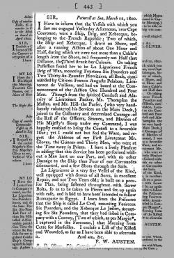 All newspapers of the time carried reports of military action on land and at sea, the provincial papers drawing on the national press for the most up-to-date reports. An exclusively naval periodical, the Naval Chronicle appeared in monthly editions from 1799 until 1818. As well as publishing original material, the Chronicle relied on other sources for the latest despatches, in particular The London Gazette. Captain Francis Austen’s account of the capture of La Ligurienne, written on board the Peterel on March 22, 1800, appeared initially in The London Gazette2 in May and was subsequently copied verbatim in the Chronicle’s “Letters on Service” section in July 1800 (3: 410).